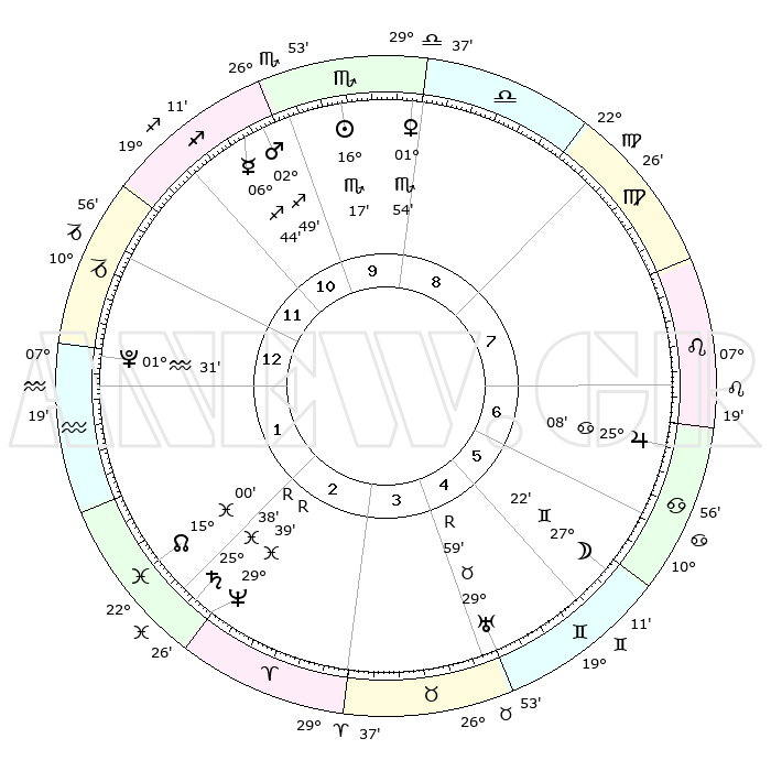| | ΘΕΣΕΙΣ ΠΛΑΝΗΤΩΝ ΑΣΤΡΟΛΟΓΙΚΟΥ ΧΑΡΤΗ ΤΗΣ ΣΤΙΓΜΗΣ ΑΥΤΗΣ | | | | Πλανήτης | Ζώδιο | Μοίρες | Δεκαήμ. | Σε οίκο | Απόκλιση | | Ακμές των οίκων | | Ηλιος | Σκορπιός | 16°11' | Δεύτερο | 10 | 16 S 41 | | 1ος | 00°01' | Αιγόκερως | | Σελήνη | Δίδυμοι | 25°55' | Τρίτο | 6 | 28 N 22 | | 2ος | 07°10' | Υδροχόος | | Ερμής | Τοξότης | 06°43' | Πρώτο | 11 | 23 S 56 | | 3ος | 17°10' | Ιχθείς | | Αφροδίτη | Σκορπιός | 01°47' | Πρώτο | 10 | 10 S 49 | | 4ος | 21°06' | Κριός | | Αρης | Τοξότης | 02°45' | Πρώτο | 11 | 21 S 09 | | 5ος | 17°25' | Ταύρος | | Δίας | Καρκίνος | 25°08' | Τρίτο | 7 | 21 N 12 | | 6ος | 09°13' | Δίδυμοι | | Κρόνος | Ιχθείς | 25°38'R | Τρίτο | 3 | 03 S 59 | | 7ος | 00°01' | Καρκίνος | | Ουρανός | Ταύρος | 29°59'R | Τρίτο | 5 | 19 N 56 | | 8ος | 07°10' | Λέων | | Ποσειδώνας | Ιχθείς | 29°39'R | Τρίτο | 3 | 01 S 23 | | 9ος | 17°10' | Παρθένος | | Πλούτωνας | Υδροχόος | 01°31' | Πρώτο | 1 | 23 S 30 | | 10ος | 21°06' | Ζυγός | | Β. Δεσμός | Ιχθείς | 15°01' | Δεύτερο | 2 | 05 S 54 | | 11ος | 17°25' | Σκορπιός | | Ωροσκόπος | Αιγόκερως | 00°01' | Πρώτο | | | 12ος | 09°13' | Τοξότης | | Μεσουράνημα | Ζυγός | 21°06' | Τρίτο | | | |