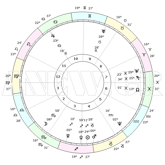 | | ΘΕΣΕΙΣ ΠΛΑΝΗΤΩΝ ΑΣΤΡΟΛΟΓΙΚΟΥ ΧΑΡΤΗ ΤΗΣ ΣΤΙΓΜΗΣ ΑΥΤΗΣ | | | | Πλανήτης | Ζώδιο | Μοίρες | Δεκαήμ. | Σε οίκο | Απόκλιση | | Ακμές των οίκων | | Ηλιος | Τοξότης | 23°12' | Τρίτο | 3 | 23 S 15 | | 1ος | 28°25' | Παρθένος | | Σελήνη | Ζυγός | 27°27' | Τρίτο | 2 | 13 S 51 | | 2ος | 24°53' | Ζυγός | | Ερμής | Τοξότης | 03°52' | Πρώτο | 3 | 19 S 24 | | 3ος | 25°16' | Σκορπιός | | Αφροδίτη | Τοξότης | 17°45' | Δεύτερο | 3 | 22 S 42 | | 4ος | 28°13' | Τοξότης | | Αρης | Τοξότης | 29°44' | Τρίτο | 4 | 24 S 12 | | 5ος | 01°13' | Υδροχόος | | Δίας | Καρκίνος | 23°22'R | Τρίτο | 10 | 21 N 36 | | 6ος | 01°43' | Ιχθείς | | Κρόνος | Ιχθείς | 25°32' | Τρίτο | 6 | 03 S 54 | | 7ος | 28°25' | Ιχθείς | | Ουρανός | Ταύρος | 28°30'R | Τρίτο | 9 | 19 N 37 | | 8ος | 24°53' | Κριός | | Ποσειδώνας | Ιχθείς | 29°23' | Τρίτο | 7 | 01 S 29 | | 9ος | 25°16' | Ταύρος | | Πλούτωνας | Υδροχόος | 02°14' | Πρώτο | 5 | 23 S 19 | | 10ος | 28°13' | Δίδυμοι | | Β. Δεσμός | Ιχθείς | 13°04' | Δεύτερο | 6 | 06 S 39 | | 11ος | 01°13' | Λέων | | Ωροσκόπος | Παρθένος | 28°25' | Τρίτο | | | 12ος | 01°43' | Παρθένος | | Μεσουράνημα | Δίδυμοι | 28°13' | Τρίτο | | | |