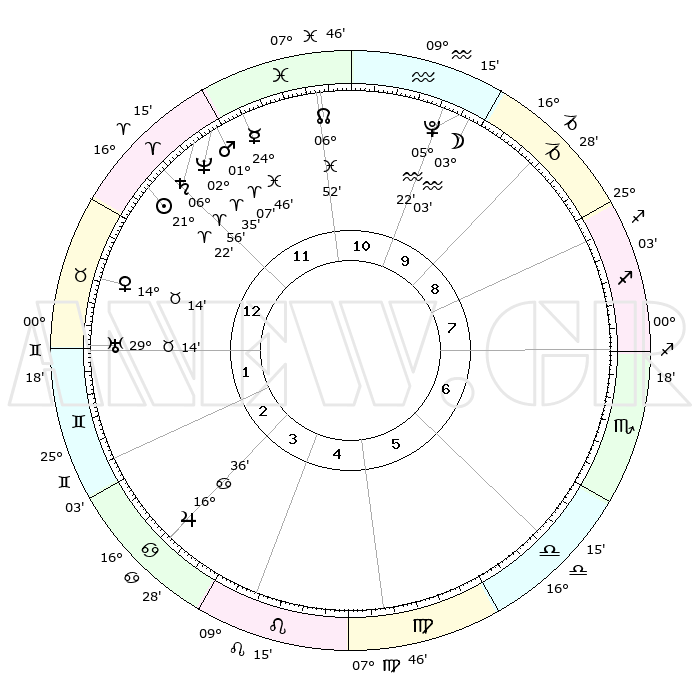 | | ΘΕΣΕΙΣ ΠΛΑΝΗΤΩΝ ΑΣΤΡΟΛΟΓΙΚΟΥ ΧΑΡΤΗ ΤΗΣ ΣΤΙΓΜΗΣ ΑΥΤΗΣ | | | | Πλανήτης | Ζώδιο | Μοίρες | Δεκαήμ. | Σε οίκο | Απόκλιση | | Ακμές των οίκων | | Ηλιος | Κριός | 21°18' | Τρίτο | 12 | 08 N 18 | | 1ος | 21°29' | Κριός | | Σελήνη | Υδροχόος | 02°05' | Πρώτο | 10 | 22 S 39 | | 2ος | 26°05' | Ταύρος | | Ερμής | Ιχθείς | 24°40' | Τρίτο | 12 | 04 S 20 | | 3ος | 20°34' | Δίδυμοι | | Αφροδίτη | Ταύρος | 14°08' | Δεύτερο | 1 | 16 N 04 | | 4ος | 12°17' | Καρκίνος | | Αρης | Κριός | 01°04' | Πρώτο | 12 | 00 S 30 | | 5ος | 05°55' | Λέων | | Δίας | Καρκίνος | 16°35' | Δεύτερο | 4 | 22 N 47 | | 6ος | 06°60' | Παρθένος | | Κρόνος | Κριός | 06°55' | Πρώτο | 12 | 00 N 47 | | 7ος | 21°29' | Ζυγός | | Ουρανός | Ταύρος | 29°14' | Τρίτο | 2 | 19 N 49 | | 8ος | 26°05' | Σκορπιός | | Ποσειδώνας | Κριός | 02°35' | Πρώτο | 12 | 00 S 11 | | 9ος | 20°34' | Τοξότης | | Πλούτωνας | Υδροχόος | 05°22' | Πρώτο | 10 | 22 S 47 | | 10ος | 12°17' | Αιγόκερως | | Β. Δεσμός | Ιχθείς | 06°52' | Πρώτο | 11 | 08 S 59 | | 11ος | 05°55' | Υδροχόος | | Ωροσκόπος | Κριός | 21°29' | Τρίτο | | | 12ος | 06°60' | Ιχθείς | | Μεσουράνημα | Αιγόκερως | 12°17' | Δεύτερο | | | |