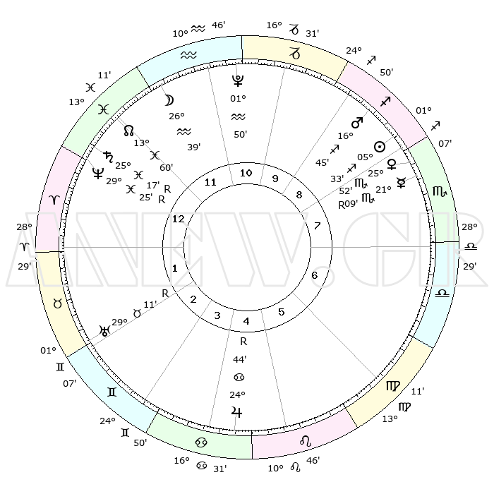 | | ΘΕΣΕΙΣ ΠΛΑΝΗΤΩΝ ΑΣΤΡΟΛΟΓΙΚΟΥ ΧΑΡΤΗ ΤΗΣ ΣΤΙΓΜΗΣ ΑΥΤΗΣ | | | | Πλανήτης | Ζώδιο | Μοίρες | Δεκαήμ. | Σε οίκο | Απόκλιση | | Ακμές των οίκων | | Ηλιος | Τοξότης | 05°31' | Πρώτο | 8 | 21 S 13 | | 1ος | 14°02' | Κριός | | Σελήνη | Υδροχόος | 26°19' | Τρίτο | 11 | 14 S 13 | | 2ος | 20°41' | Ταύρος | | Ερμής | Σκορπιός | 21°10'R | Τρίτο | 8 | 15 S 48 | | 3ος | 16°06' | Δίδυμοι | | Αφροδίτη | Σκορπιός | 25°50' | Τρίτο | 8 | 18 S 24 | | 4ος | 07°56' | Καρκίνος | | Αρης | Τοξότης | 16°44' | Δεύτερο | 9 | 23 S 24 | | 5ος | 01°01' | Λέων | | Δίας | Καρκίνος | 24°44'R | Τρίτο | 4 | 21 N 19 | | 6ος | 00°44' | Παρθένος | | Κρόνος | Ιχθείς | 25°17'R | Τρίτο | 12 | 04 S 04 | | 7ος | 14°02' | Ζυγός | | Ουρανός | Ταύρος | 29°11'R | Τρίτο | 2 | 19 N 46 | | 8ος | 20°41' | Σκορπιός | | Ποσειδώνας | Ιχθείς | 29°25'R | Τρίτο | 12 | 01 S 28 | | 9ος | 16°06' | Τοξότης | | Πλούτωνας | Υδροχόος | 01°50' | Πρώτο | 11 | 23 S 25 | | 10ος | 07°56' | Αιγόκερως | | Β. Δεσμός | Ιχθείς | 13°60' | Δεύτερο | 12 | 06 S 18 | | 11ος | 01°01' | Υδροχόος | | Ωροσκόπος | Κριός | 14°02' | Δεύτερο | | | 12ος | 00°44' | Ιχθείς | | Μεσουράνημα | Αιγόκερως | 07°56' | Πρώτο | | | |