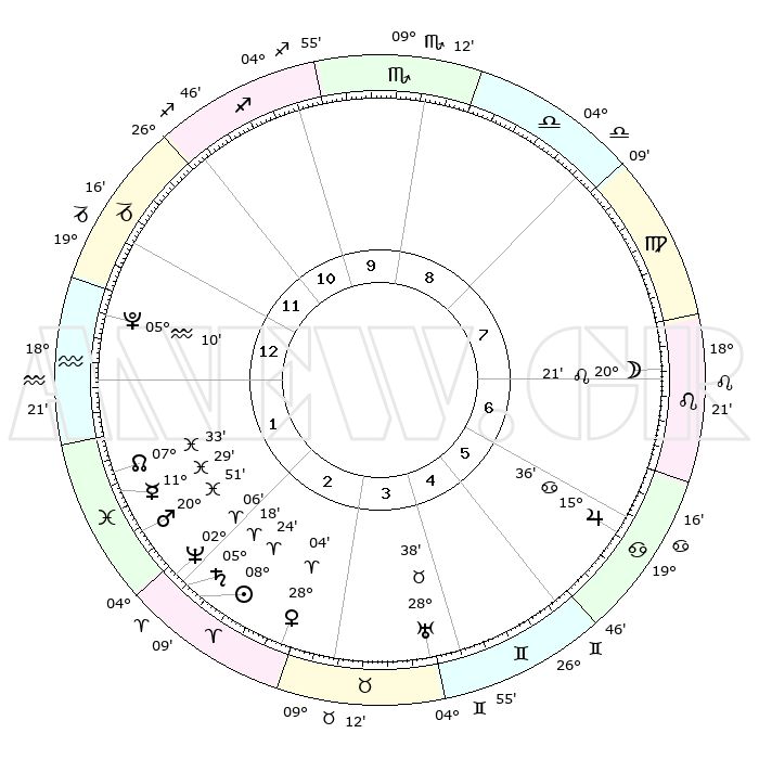 | | ΘΕΣΕΙΣ ΠΛΑΝΗΤΩΝ ΑΣΤΡΟΛΟΓΙΚΟΥ ΧΑΡΤΗ ΤΗΣ ΣΤΙΓΜΗΣ ΑΥΤΗΣ | | | | Πλανήτης | Ζώδιο | Μοίρες | Δεκαήμ. | Σε οίκο | Απόκλιση | | Ακμές των οίκων | | Ηλιος | Κριός | 08°21' | Πρώτο | 2 | 03 N 19 | | 1ος | 21°02' | Αιγόκερως | | Σελήνη | Λέων | 19°31' | Δεύτερο | 7 | 16 N 36 | | 2ος | 03°23' | Ιχθείς | | Ερμής | Ιχθείς | 11°27' | Δεύτερο | 2 | 08 S 01 | | 3ος | 13°01' | Κριός | | Αφροδίτη | Κριός | 27°60' | Τρίτο | 3 | 10 N 14 | | 4ος | 13°06' | Ταύρος | | Αρης | Ιχθείς | 20°48' | Τρίτο | 2 | 04 S 37 | | 5ος | 06°39' | Δίδυμοι | | Δίας | Καρκίνος | 15°36' | Δεύτερο | 6 | 22 N 53 | | 6ος | 27°52' | Δίδυμοι | | Κρόνος | Κριός | 05°18' | Πρώτο | 2 | 00 N 09 | | 7ος | 21°02' | Καρκίνος | | Ουρανός | Ταύρος | 28°38' | Τρίτο | 4 | 19 N 41 | | 8ος | 03°23' | Παρθένος | | Ποσειδώνας | Κριός | 02°06' | Πρώτο | 2 | 00 S 22 | | 9ος | 13°01' | Ζυγός | | Πλούτωνας | Υδροχόος | 05°10' | Πρώτο | 1 | 22 S 48 | | 10ος | 13°06' | Σκορπιός | | Β. Δεσμός | Ιχθείς | 07°34' | Πρώτο | 2 | 08 S 44 | | 11ος | 06°39' | Τοξότης | | Ωροσκόπος | Αιγόκερως | 21°02' | Τρίτο | | | 12ος | 27°52' | Τοξότης | | Μεσουράνημα | Σκορπιός | 13°06' | Δεύτερο | | | |