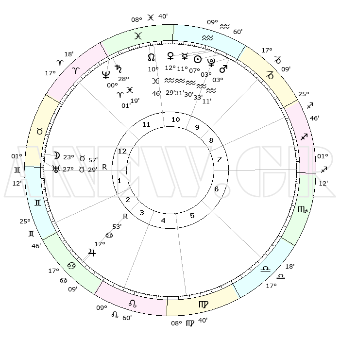 | | ΘΕΣΕΙΣ ΠΛΑΝΗΤΩΝ ΑΣΤΡΟΛΟΓΙΚΟΥ ΧΑΡΤΗ ΤΗΣ ΣΤΙΓΜΗΣ ΑΥΤΗΣ | | | | Πλανήτης | Ζώδιο | Μοίρες | Δεκαήμ. | Σε οίκο | Απόκλιση | | Ακμές των οίκων | | Ηλιος | Υδροχόος | 07°27' | Πρώτο | 10 | 18 S 24 | | 1ος | 03°59' | Ταύρος | | Σελήνη | Ταύρος | 23°08' | Τρίτο | 1 | 23 N 23 | | 2ος | 05°07' | Δίδυμοι | | Ερμής | Υδροχόος | 11°25' | Δεύτερο | 10 | 19 S 20 | | 3ος | 28°17' | Δίδυμοι | | Αφροδίτη | Υδροχόος | 12°24' | Δεύτερο | 10 | 18 S 18 | | 4ος | 19°60' | Καρκίνος | | Αρης | Υδροχόος | 03°08' | Πρώτο | 10 | 20 S 27 | | 5ος | 14°49' | Λέων | | Δίας | Καρκίνος | 17°53'R | Δεύτερο | 3 | 22 N 32 | | 6ος | 18°19' | Παρθένος | | Κρόνος | Ιχθείς | 28°19' | Τρίτο | 12 | 02 S 41 | | 7ος | 03°59' | Σκορπιός | | Ουρανός | Ταύρος | 27°29'R | Τρίτο | 1 | 19 N 24 | | 8ος | 05°07' | Τοξότης | | Ποσειδώνας | Κριός | 00°01' | Πρώτο | 12 | 01 S 12 | | 9ος | 28°17' | Τοξότης | | Πλούτωνας | Υδροχόος | 03°33' | Πρώτο | 10 | 23 S 03 | | 10ος | 19°60' | Αιγόκερως | | Β. Δεσμός | Ιχθείς | 10°46' | Δεύτερο | 11 | 07 S 32 | | 11ος | 14°49' | Υδροχόος | | Ωροσκόπος | Ταύρος | 03°59' | Πρώτο | | | 12ος | 18°19' | Ιχθείς | | Μεσουράνημα | Αιγόκερως | 19°60' | Δεύτερο | | | |