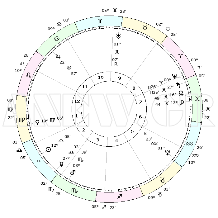 | ΘΕΣΕΙΣ ΠΛΑΝΗΤΩΝ ΑΣΤΡΟΛΟΓΙΚΟΥ ΧΑΡΤΗ ΤΗΣ ΣΤΙΓΜΗΣ ΑΥΤΗΣ | | Πλανήτης | Ζώδιο | Μοίρες | Δεκαήμ. | Σε οίκο | Απόκλιση | | Ακμές των οίκων | Ηλιος | Ζυγός | 11°58' | Δεύτερο | 3 | 04 S 44 | | 1ος | 04°30' | Λέων | Σελήνη | Ιχθείς | 12°04' | Δεύτερο | 8 | 07 S 33 | | 2ος | 25°51' | Λέων | Ερμής | Ζυγός | 27°22' | Τρίτο | 4 | 11 S 04 | | 3ος | 21°31' | Παρθένος | Αφροδίτη | Παρθένος | 18°57' | Δεύτερο | 2 | 05 N 38 | | 4ος | 23°04' | Ζυγός | Αρης | Σκορπιός | 08°34' | Πρώτο | 4 | 14 S 28 | | 5ος | 28°58' | Σκορπιός | Δίας | Καρκίνος | 22°56' | Τρίτο | 12 | 21 N 31 | | 6ος | 03°56' | Αιγόκερως | Κρόνος | Ιχθείς | 27°36'R | Τρίτο | 9 | 03 S 16 | | 7ος | 04°30' | Υδροχόος | Ουρανός | Δίδυμοι | 01°07'R | Πρώτο | 11 | 20 N 10 | | 8ος | 25°51' | Υδροχόος | Ποσειδώνας | Κριός | 00°26'R | Πρώτο | 9 | 01 S 05 | | 9ος | 21°31' | Ιχθείς | Πλούτωνας | Υδροχόος | 01°23'R | Πρώτο | 6 | 23 S 32 | | 10ος | 23°04' | Κριός | Β. Δεσμός | Ιχθείς | 16°50' | Δεύτερο | 8 | 05 S 12 | | 11ος | 28°58' | Ταύρος | Ωροσκόπος | Λέων | 04°30' | Πρώτο | | | 12ος | 03°56' | Καρκίνος | Μεσουράνημα | Κριός | 23°04' | Τρίτο | | | |