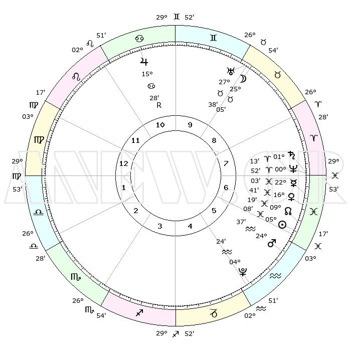 | | ΘΕΣΕΙΣ ΠΛΑΝΗΤΩΝ ΑΣΤΡΟΛΟΓΙΚΟΥ ΧΑΡΤΗ ΤΗΣ ΣΤΙΓΜΗΣ ΑΥΤΗΣ | | | | Πλανήτης | Ζώδιο | Μοίρες | Δεκαήμ. | Σε οίκο | Απόκλιση | | Ακμές των οίκων | | Ηλιος | Ιχθείς | 05°04' | Πρώτο | 6 | 09 S 39 | | 1ος | 08°26' | Παρθένος | | Σελήνη | Ταύρος | 24°03' | Τρίτο | 9 | 23 N 43 | | 2ος | 03°09' | Ζυγός | | Ερμής | Ιχθείς | 22°01' | Τρίτο | 7 | 01 S 10 | | 3ος | 02°30' | Σκορπιός | | Αφροδίτη | Ιχθείς | 16°36' | Δεύτερο | 7 | 06 S 36 | | 4ος | 05°27' | Τοξότης | | Αρης | Υδροχόος | 24°34' | Τρίτο | 6 | 14 S 22 | | 5ος | 09°08' | Αιγόκερως | | Δίας | Καρκίνος | 15°28'R | Δεύτερο | 11 | 22 N 52 | | 6ος | 10°30' | Υδροχόος | | Κρόνος | Κριός | 01°13' | Πρώτο | 7 | 01 S 29 | | 7ος | 08°26' | Ιχθείς | | Ουρανός | Ταύρος | 27°38' | Τρίτο | 9 | 19 N 27 | | 8ος | 03°09' | Κριός | | Ποσειδώνας | Κριός | 00°52' | Πρώτο | 7 | 00 S 51 | | 9ος | 02°30' | Ταύρος | | Πλούτωνας | Υδροχόος | 04°23' | Πρώτο | 5 | 22 S 54 | | 10ος | 05°27' | Δίδυμοι | | Β. Δεσμός | Ιχθείς | 09°20' | Πρώτο | 7 | 08 S 04 | | 11ος | 09°08' | Καρκίνος | | Ωροσκόπος | Παρθένος | 08°26' | Πρώτο | | | 12ος | 10°30' | Λέων | | Μεσουράνημα | Δίδυμοι | 05°27' | Πρώτο | | | |