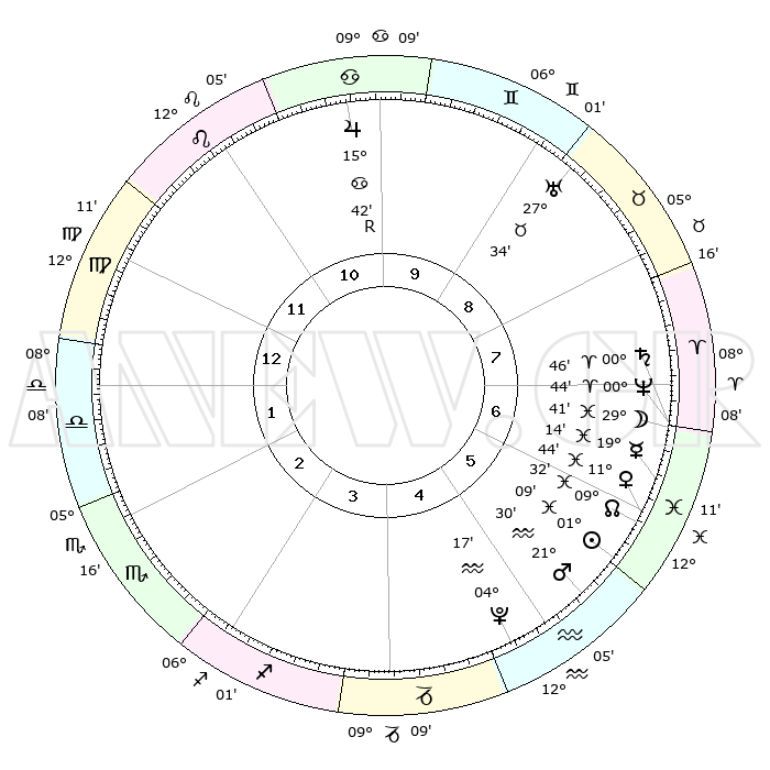 | | ΘΕΣΕΙΣ ΠΛΑΝΗΤΩΝ ΑΣΤΡΟΛΟΓΙΚΟΥ ΧΑΡΤΗ ΤΗΣ ΣΤΙΓΜΗΣ ΑΥΤΗΣ | | | | Πλανήτης | Ζώδιο | Μοίρες | Δεκαήμ. | Σε οίκο | Απόκλιση | | Ακμές των οίκων | | Ηλιος | Ιχθείς | 01°04' | Πρώτο | 6 | 11 S 06 | | 1ος | 12°58' | Παρθένος | | Σελήνη | Ιχθείς | 28°31' | Τρίτο | 7 | 01 N 03 | | 2ος | 08°08' | Ζυγός | | Ερμής | Ιχθείς | 19°09' | Δεύτερο | 7 | 03 S 13 | | 3ος | 07°46' | Σκορπιός | | Αφροδίτη | Ιχθείς | 11°38' | Δεύτερο | 6 | 08 S 33 | | 4ος | 10°43' | Τοξότης | | Αρης | Υδροχόος | 21°26' | Τρίτο | 6 | 15 S 23 | | 5ος | 14°09' | Αιγόκερως | | Δίας | Καρκίνος | 15°42'R | Δεύτερο | 11 | 22 N 50 | | 6ος | 15°18' | Υδροχόος | | Κρόνος | Κριός | 00°45' | Πρώτο | 7 | 01 S 40 | | 7ος | 12°58' | Ιχθείς | | Ουρανός | Ταύρος | 27°34' | Τρίτο | 9 | 19 N 26 | | 8ος | 08°08' | Κριός | | Ποσειδώνας | Κριός | 00°43' | Πρώτο | 7 | 00 S 55 | | 9ος | 07°46' | Ταύρος | | Πλούτωνας | Υδροχόος | 04°16' | Πρώτο | 5 | 22 S 55 | | 10ος | 10°43' | Δίδυμοι | | Β. Δεσμός | Ιχθείς | 09°32' | Πρώτο | 6 | 08 S 00 | | 11ος | 14°09' | Καρκίνος | | Ωροσκόπος | Παρθένος | 12°58' | Δεύτερο | | | 12ος | 15°18' | Λέων | | Μεσουράνημα | Δίδυμοι | 10°43' | Δεύτερο | | | |