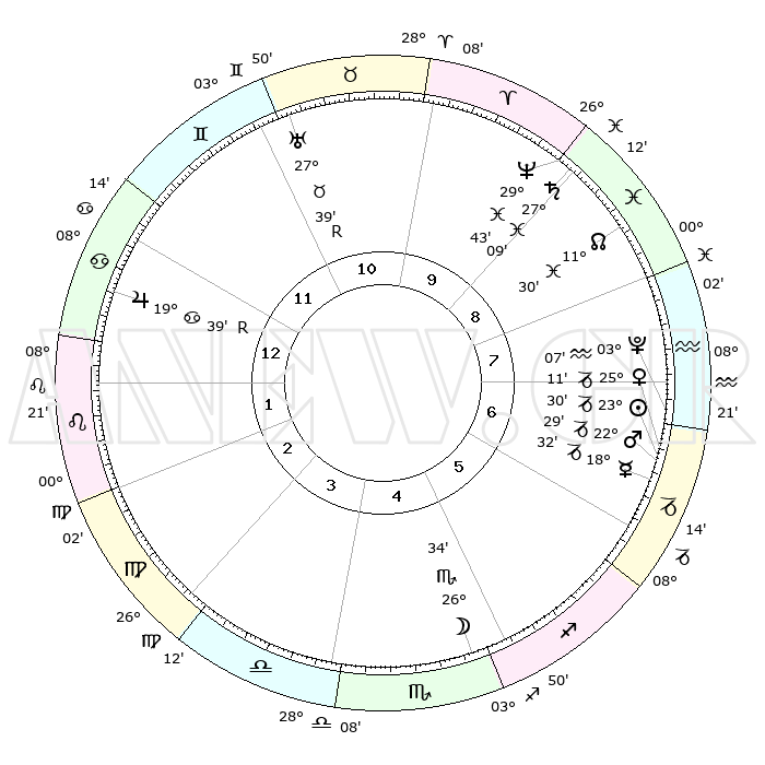 | | ΘΕΣΕΙΣ ΠΛΑΝΗΤΩΝ ΑΣΤΡΟΛΟΓΙΚΟΥ ΧΑΡΤΗ ΤΗΣ ΣΤΙΓΜΗΣ ΑΥΤΗΣ | | | | Πλανήτης | Ζώδιο | Μοίρες | Δεκαήμ. | Σε οίκο | Απόκλιση | | Ακμές των οίκων | | Ηλιος | Αιγόκερως | 23°26' | Τρίτο | 7 | 21 S 24 | | 1ος | 19°47' | Καρκίνος | | Σελήνη | Σκορπιός | 25°49' | Τρίτο | 5 | 24 S 02 | | 2ος | 10°19' | Λέων | | Ερμής | Αιγόκερως | 18°26' | Δεύτερο | 6 | 23 S 51 | | 3ος | 04°02' | Παρθένος | | Αφροδίτη | Αιγόκερως | 25°06' | Τρίτο | 7 | 22 S 02 | | 4ος | 03°37' | Ζυγός | | Αρης | Αιγόκερως | 22°26' | Τρίτο | 7 | 22 S 31 | | 5ος | 09°36' | Σκορπιός | | Δίας | Καρκίνος | 19°40'R | Δεύτερο | 12 | 22 N 15 | | 6ος | 17°02' | Τοξότης | | Κρόνος | Ιχθείς | 27°08' | Τρίτο | 9 | 03 S 11 | | 7ος | 19°47' | Αιγόκερως | | Ουρανός | Ταύρος | 27°39'R | Τρίτο | 11 | 19 N 27 | | 8ος | 10°19' | Υδροχόος | | Ποσειδώνας | Ιχθείς | 29°43' | Τρίτο | 9 | 01 S 20 | | 9ος | 04°02' | Ιχθείς | | Πλούτωνας | Υδροχόος | 03°07' | Πρώτο | 7 | 23 S 08 | | 10ος | 03°37' | Κριός | | Β. Δεσμός | Ιχθείς | 11°30' | Δεύτερο | 9 | 07 S 15 | | 11ος | 09°36' | Ταύρος | | Ωροσκόπος | Καρκίνος | 19°47' | Δεύτερο | | | 12ος | 17°02' | Δίδυμοι | | Μεσουράνημα | Κριός | 03°37' | Πρώτο | | | |