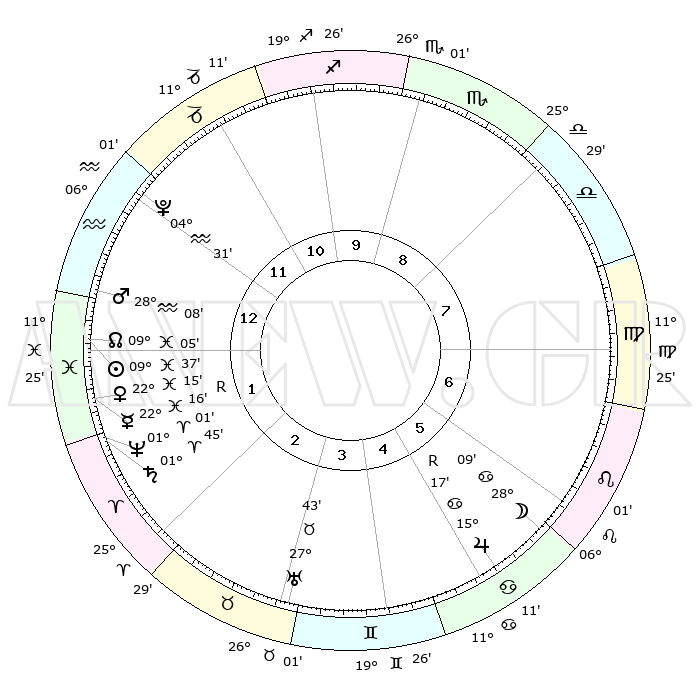 | | ΘΕΣΕΙΣ ΠΛΑΝΗΤΩΝ ΑΣΤΡΟΛΟΓΙΚΟΥ ΧΑΡΤΗ ΤΗΣ ΣΤΙΓΜΗΣ ΑΥΤΗΣ | | | | Πλανήτης | Ζώδιο | Μοίρες | Δεκαήμ. | Σε οίκο | Απόκλιση | | Ακμές των οίκων | | Ηλιος | Ιχθείς | 09°33' | Πρώτο | 1 | 07 S 59 | | 1ος | 04°38' | Υδροχόος | | Σελήνη | Καρκίνος | 27°09' | Τρίτο | 6 | 24 N 11 | | 2ος | 19°25' | Ιχθείς | | Ερμής | Ιχθείς | 22°17'R | Τρίτο | 2 | 00 S 10 | | 3ος | 27°06' | Κριός | | Αφροδίτη | Ιχθείς | 22°09' | Τρίτο | 2 | 04 S 22 | | 4ος | 24°47' | Ταύρος | | Αρης | Υδροχόος | 28°05' | Τρίτο | 1 | 13 S 10 | | 5ος | 17°14' | Δίδυμοι | | Δίας | Καρκίνος | 15°17'R | Δεύτερο | 6 | 22 N 54 | | 6ος | 08°51' | Καρκίνος | | Κρόνος | Κριός | 01°44' | Πρώτο | 2 | 01 S 16 | | 7ος | 04°38' | Λέων | | Ουρανός | Ταύρος | 27°43' | Τρίτο | 4 | 19 N 28 | | 8ος | 19°25' | Παρθένος | | Ποσειδώνας | Κριός | 01°01' | Πρώτο | 2 | 00 S 48 | | 9ος | 27°06' | Ζυγός | | Πλούτωνας | Υδροχόος | 04°31' | Πρώτο | 12 | 22 S 53 | | 10ος | 24°47' | Σκορπιός | | Β. Δεσμός | Ιχθείς | 09°05' | Πρώτο | 1 | 08 S 10 | | 11ος | 17°14' | Τοξότης | | Ωροσκόπος | Υδροχόος | 04°38' | Πρώτο | | | 12ος | 08°51' | Αιγόκερως | | Μεσουράνημα | Σκορπιός | 24°47' | Τρίτο | | | |