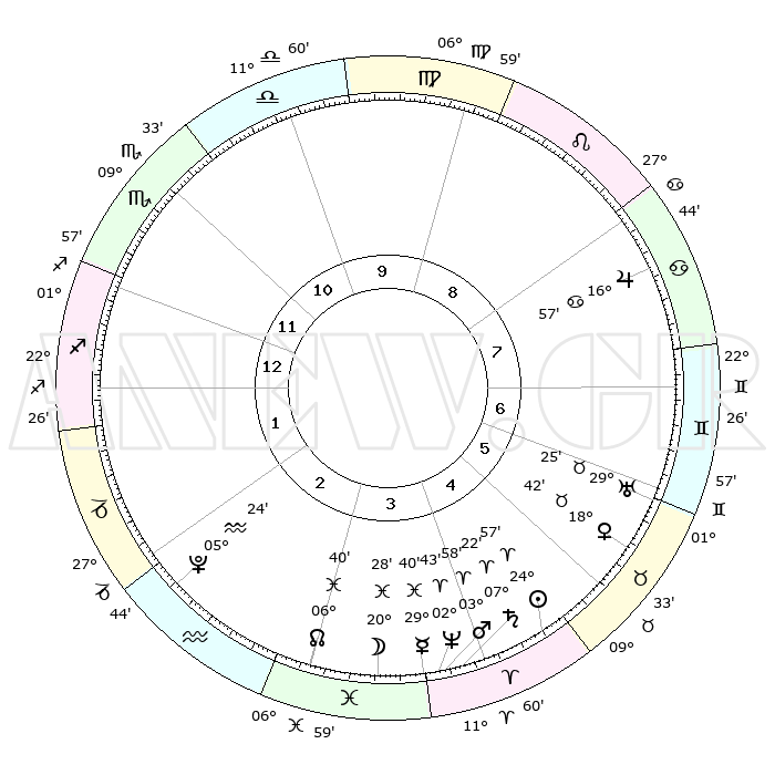 | | ΘΕΣΕΙΣ ΠΛΑΝΗΤΩΝ ΑΣΤΡΟΛΟΓΙΚΟΥ ΧΑΡΤΗ ΤΗΣ ΣΤΙΓΜΗΣ ΑΥΤΗΣ | | | | Πλανήτης | Ζώδιο | Μοίρες | Δεκαήμ. | Σε οίκο | Απόκλιση | | Ακμές των οίκων | | Ηλιος | Κριός | 24°51' | Τρίτο | 5 | 09 N 37 | | 1ος | 21°06' | Σκορπιός | | Σελήνη | Ιχθείς | 19°02' | Δεύτερο | 4 | 03 S 27 | | 2ος | 21°09' | Τοξότης | | Ερμής | Ιχθείς | 29°32' | Τρίτο | 4 | 02 S 34 | | 3ος | 25°28' | Αιγόκερως | | Αφροδίτη | Ταύρος | 18°35' | Δεύτερο | 6 | 17 N 30 | | 4ος | 01°09' | Ιχθείς | | Αρης | Κριός | 03°53' | Πρώτο | 5 | 00 N 38 | | 5ος | 03°07' | Κριός | | Δίας | Καρκίνος | 16°57' | Δεύτερο | 8 | 22 N 44 | | 6ος | 29°22' | Κριός | | Κρόνος | Κριός | 07°22' | Πρώτο | 5 | 00 N 57 | | 7ος | 21°06' | Ταύρος | | Ουρανός | Ταύρος | 29°25' | Τρίτο | 7 | 19 N 51 | | 8ος | 21°09' | Δίδυμοι | | Ποσειδώνας | Κριός | 02°43' | Πρώτο | 4 | 00 S 07 | | 9ος | 25°28' | Καρκίνος | | Πλούτωνας | Υδροχόος | 05°24' | Πρώτο | 3 | 22 S 47 | | 10ος | 01°09' | Παρθένος | | Β. Δεσμός | Ιχθείς | 06°40' | Πρώτο | 4 | 09 S 04 | | 11ος | 03°07' | Ζυγός | | Ωροσκόπος | Σκορπιός | 21°06' | Τρίτο | | | 12ος | 29°22' | Ζυγός | | Μεσουράνημα | Παρθένος | 01°09' | Πρώτο | | | |