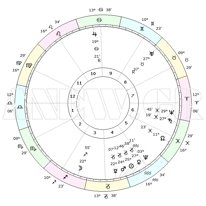 | | ΘΕΣΕΙΣ ΠΛΑΝΗΤΩΝ ΑΣΤΡΟΛΟΓΙΚΟΥ ΧΑΡΤΗ ΤΗΣ ΣΤΙΓΜΗΣ ΑΥΤΗΣ | | | | Πλανήτης | Ζώδιο | Μοίρες | Δεκαήμ. | Σε οίκο | Απόκλιση | | Ακμές των οίκων | | Ηλιος | Αιγόκερως | 25°41' | Τρίτο | 5 | 21 S 00 | | 1ος | 20°48' | Παρθένος | | Σελήνη | Τοξότης | 22°03' | Τρίτο | 4 | 28 S 12 | | 2ος | 16°40' | Ζυγός | | Ερμής | Αιγόκερως | 21°60' | Τρίτο | 4 | 23 S 27 | | 3ος | 16°43' | Σκορπιός | | Αφροδίτη | Αιγόκερως | 27°53' | Τρίτο | 5 | 21 S 34 | | 4ος | 19°39' | Τοξότης | | Αρης | Αιγόκερως | 24°08' | Τρίτο | 5 | 22 S 14 | | 5ος | 22°49' | Αιγόκερως | | Δίας | Καρκίνος | 19°22'R | Δεύτερο | 10 | 22 N 18 | | 6ος | 23°36' | Υδροχόος | | Κρόνος | Ιχθείς | 27°19' | Τρίτο | 7 | 03 S 06 | | 7ος | 20°48' | Ιχθείς | | Ουρανός | Ταύρος | 27°37'R | Τρίτο | 9 | 19 N 26 | | 8ος | 16°40' | Κριός | | Ποσειδώνας | Ιχθείς | 29°45' | Τρίτο | 7 | 01 S 19 | | 9ος | 16°43' | Ταύρος | | Πλούτωνας | Υδροχόος | 03°11' | Πρώτο | 5 | 23 S 07 | | 10ος | 19°39' | Δίδυμοι | | Β. Δεσμός | Ιχθείς | 11°23' | Δεύτερο | 6 | 07 S 18 | | 11ος | 22°49' | Καρκίνος | | Ωροσκόπος | Παρθένος | 20°48' | Τρίτο | | | 12ος | 23°36' | Λέων | | Μεσουράνημα | Δίδυμοι | 19°39' | Δεύτερο | | | |