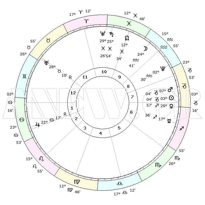 | | ΘΕΣΕΙΣ ΠΛΑΝΗΤΩΝ ΑΣΤΡΟΛΟΓΙΚΟΥ ΧΑΡΤΗ ΤΗΣ ΣΤΙΓΜΗΣ ΑΥΤΗΣ | | | | Πλανήτης | Ζώδιο | Μοίρες | Δεκαήμ. | Σε οίκο | Απόκλιση | | Ακμές των οίκων | | Ηλιος | Αιγόκερως | 02°59' | Πρώτο | 8 | 23 S 24 | | 1ος | 04°45' | Δίδυμοι | | Σελήνη | Υδροχόος | 23°41' | Τρίτο | 10 | 15 S 04 | | 2ος | 28°38' | Δίδυμοι | | Ερμής | Τοξότης | 17°29' | Δεύτερο | 7 | 22 S 32 | | 3ος | 19°55' | Καρκίνος | | Αφροδίτη | Τοξότης | 29°51' | Τρίτο | 8 | 23 S 39 | | 4ος | 13°04' | Λέων | | Αρης | Αιγόκερως | 07°01' | Πρώτο | 8 | 24 S 05 | | 5ος | 12°22' | Παρθένος | | Δίας | Καρκίνος | 22°18'R | Τρίτο | 3 | 21 N 48 | | 6ος | 21°30' | Ζυγός | | Κρόνος | Ιχθείς | 25°54' | Τρίτο | 11 | 03 S 44 | | 7ος | 04°45' | Τοξότης | | Ουρανός | Ταύρος | 28°10'R | Τρίτο | 12 | 19 N 33 | | 8ος | 28°38' | Τοξότης | | Ποσειδώνας | Ιχθείς | 29°26' | Τρίτο | 11 | 01 S 27 | | 9ος | 19°55' | Αιγόκερως | | Πλούτωνας | Υδροχόος | 02°30' | Πρώτο | 9 | 23 S 16 | | 10ος | 13°04' | Υδροχόος | | Β. Δεσμός | Ιχθείς | 12°34' | Δεύτερο | 11 | 06 S 51 | | 11ος | 12°22' | Ιχθείς | | Ωροσκόπος | Δίδυμοι | 04°45' | Πρώτο | | | 12ος | 21°30' | Κριός | | Μεσουράνημα | Υδροχόος | 13°04' | Δεύτερο | | | |