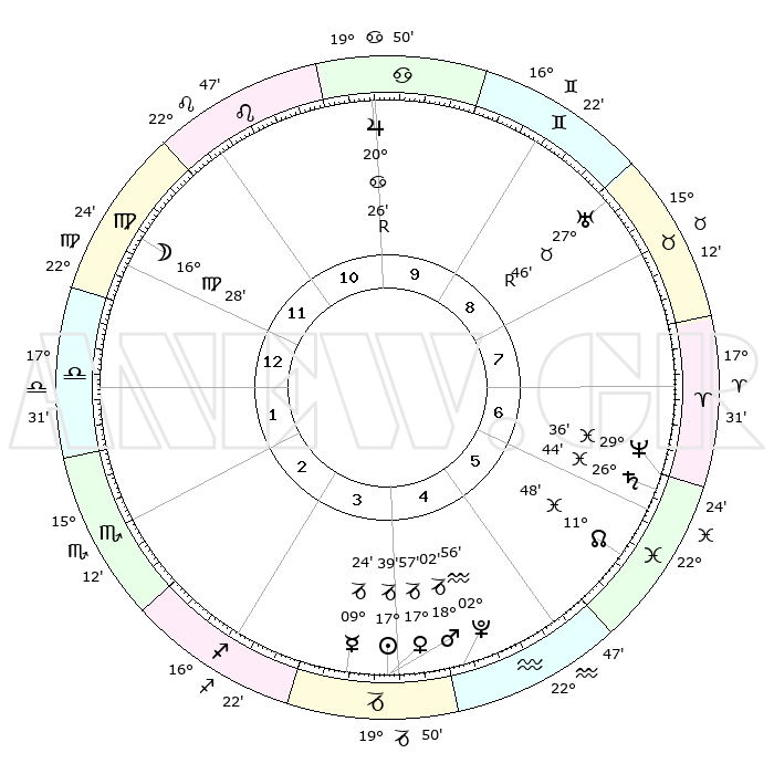 | | ΘΕΣΕΙΣ ΠΛΑΝΗΤΩΝ ΑΣΤΡΟΛΟΓΙΚΟΥ ΧΑΡΤΗ ΤΗΣ ΣΤΙΓΜΗΣ ΑΥΤΗΣ | | | | Πλανήτης | Ζώδιο | Μοίρες | Δεκαήμ. | Σε οίκο | Απόκλιση | | Ακμές των οίκων | | Ηλιος | Αιγόκερως | 16°32' | Δεύτερο | 4 | 22 S 25 | | 1ος | 20°19' | Παρθένος | | Σελήνη | Παρθένος | 02°02' | Πρώτο | 12 | 11 N 26 | | 2ος | 16°08' | Ζυγός | | Ερμής | Αιγόκερως | 07°42' | Πρώτο | 4 | 24 S 22 | | 3ος | 16°10' | Σκορπιός | | Αφροδίτη | Αιγόκερως | 16°35' | Δεύτερο | 4 | 23 S 07 | | 4ος | 19°06' | Τοξότης | | Αρης | Αιγόκερως | 17°12' | Δεύτερο | 4 | 23 S 15 | | 5ος | 22°16' | Αιγόκερως | | Δίας | Καρκίνος | 20°35'R | Τρίτο | 10 | 22 N 06 | | 6ος | 23°05' | Υδροχόος | | Κρόνος | Ιχθείς | 26°39' | Τρίτο | 7 | 03 S 23 | | 7ος | 20°19' | Ιχθείς | | Ουρανός | Ταύρος | 27°48'R | Τρίτο | 9 | 19 N 28 | | 8ος | 16°08' | Κριός | | Ποσειδώνας | Ιχθείς | 29°35' | Τρίτο | 7 | 01 S 23 | | 9ος | 16°10' | Ταύρος | | Πλούτωνας | Υδροχόος | 02°54' | Πρώτο | 5 | 23 S 11 | | 10ος | 19°06' | Δίδυμοι | | Β. Δεσμός | Ιχθείς | 11°52' | Δεύτερο | 6 | 07 S 07 | | 11ος | 22°16' | Καρκίνος | | Ωροσκόπος | Παρθένος | 20°19' | Τρίτο | | | 12ος | 23°05' | Λέων | | Μεσουράνημα | Δίδυμοι | 19°06' | Δεύτερο | | | |