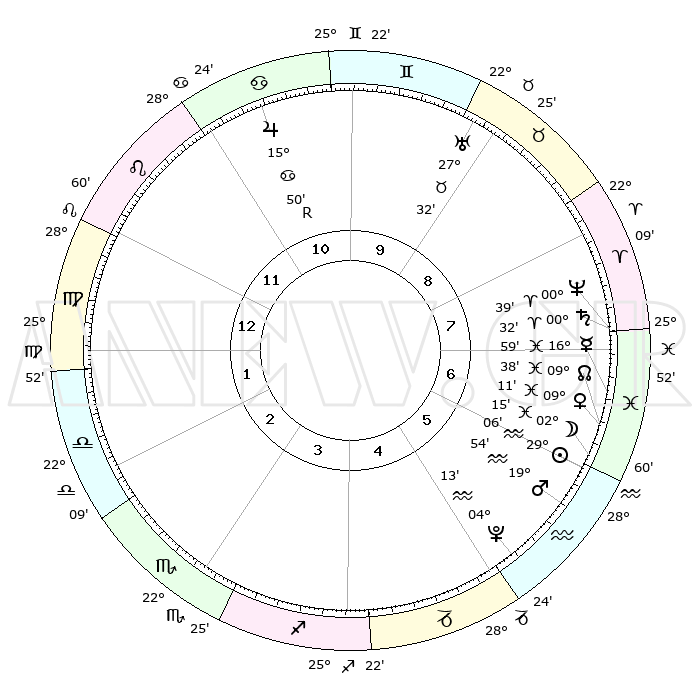 | | ΘΕΣΕΙΣ ΠΛΑΝΗΤΩΝ ΑΣΤΡΟΛΟΓΙΚΟΥ ΧΑΡΤΗ ΤΗΣ ΣΤΙΓΜΗΣ ΑΥΤΗΣ | | | | Πλανήτης | Ζώδιο | Μοίρες | Δεκαήμ. | Σε οίκο | Απόκλιση | | Ακμές των οίκων | | Ηλιος | Υδροχόος | 29°01' | Τρίτο | 6 | 11 S 49 | | 1ος | 05°04' | Παρθένος | | Σελήνη | Ιχθείς | 01°19' | Πρώτο | 6 | 11 S 40 | | 2ος | 29°27' | Παρθένος | | Ερμής | Ιχθείς | 16°54' | Δεύτερο | 7 | 04 S 33 | | 3ος | 28°33' | Ζυγός | | Αφροδίτη | Ιχθείς | 09°06' | Πρώτο | 7 | 09 S 31 | | 4ος | 01°30' | Τοξότης | | Αρης | Υδροχόος | 19°51' | Δεύτερο | 6 | 15 S 53 | | 5ος | 05°21' | Αιγόκερως | | Δίας | Καρκίνος | 15°50'R | Δεύτερο | 11 | 22 N 49 | | 6ος | 06°57' | Υδροχόος | | Κρόνος | Κριός | 00°32' | Πρώτο | 8 | 01 S 46 | | 7ος | 05°04' | Ιχθείς | | Ουρανός | Ταύρος | 27°32' | Τρίτο | 9 | 19 N 26 | | 8ος | 29°27' | Ιχθείς | | Ποσειδώνας | Κριός | 00°39' | Πρώτο | 8 | 00 S 56 | | 9ος | 28°33' | Κριός | | Πλούτωνας | Υδροχόος | 04°13' | Πρώτο | 5 | 22 S 56 | | 10ος | 01°30' | Δίδυμοι | | Β. Δεσμός | Ιχθείς | 09°39' | Πρώτο | 7 | 07 S 57 | | 11ος | 05°21' | Καρκίνος | | Ωροσκόπος | Παρθένος | 05°04' | Πρώτο | | | 12ος | 06°57' | Λέων | | Μεσουράνημα | Δίδυμοι | 01°30' | Πρώτο | | | |