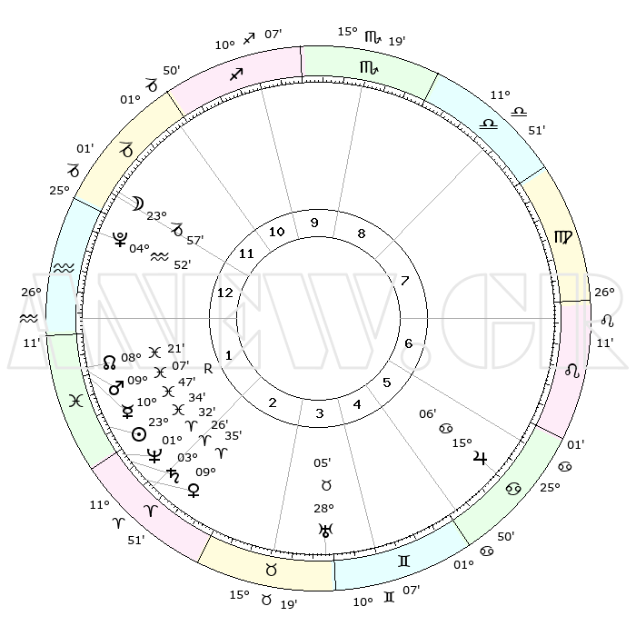 | | ΘΕΣΕΙΣ ΠΛΑΝΗΤΩΝ ΑΣΤΡΟΛΟΓΙΚΟΥ ΧΑΡΤΗ ΤΗΣ ΣΤΙΓΜΗΣ ΑΥΤΗΣ | | | | Πλανήτης | Ζώδιο | Μοίρες | Δεκαήμ. | Σε οίκο | Απόκλιση | | Ακμές των οίκων | | Ηλιος | Ιχθείς | 24°09' | Τρίτο | 6 | 02 S 19 | | 1ος | 09°39' | Ζυγός | | Σελήνη | Υδροχόος | 01°17' | Πρώτο | 4 | 23 S 01 | | 2ος | 06°53' | Σκορπιός | | Ερμής | Ιχθείς | 10°24'R | Δεύτερο | 5 | 05 S 22 | | 3ος | 07°42' | Τοξότης | | Αφροδίτη | Κριός | 10°19' | Δεύτερο | 7 | 03 N 07 | | 4ος | 10°52' | Αιγόκερως | | Αρης | Ιχθείς | 09°35' | Πρώτο | 5 | 08 S 59 | | 5ος | 13°48' | Υδροχόος | | Δίας | Καρκίνος | 15°06' | Δεύτερο | 10 | 22 N 56 | | 6ος | 13°49' | Ιχθείς | | Κρόνος | Κριός | 03°31' | Πρώτο | 6 | 00 S 33 | | 7ος | 09°39' | Κριός | | Ουρανός | Ταύρος | 28°06' | Τρίτο | 8 | 19 N 34 | | 8ος | 06°53' | Ταύρος | | Ποσειδώνας | Κριός | 01°33' | Πρώτο | 6 | 00 S 35 | | 9ος | 07°42' | Δίδυμοι | | Πλούτωνας | Υδροχόος | 04°53' | Πρώτο | 4 | 22 S 50 | | 10ος | 10°52' | Καρκίνος | | Β. Δεσμός | Ιχθείς | 08°19' | Πρώτο | 5 | 08 S 27 | | 11ος | 13°48' | Λέων | | Ωροσκόπος | Ζυγός | 09°39' | Πρώτο | | | 12ος | 13°49' | Παρθένος | | Μεσουράνημα | Καρκίνος | 10°52' | Δεύτερο | | | |