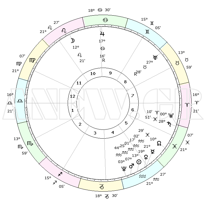 | | ΘΕΣΕΙΣ ΠΛΑΝΗΤΩΝ ΑΣΤΡΟΛΟΓΙΚΟΥ ΧΑΡΤΗ ΤΗΣ ΣΤΙΓΜΗΣ ΑΥΤΗΣ | | | | Πλανήτης | Ζώδιο | Μοίρες | Δεκαήμ. | Σε οίκο | Απόκλιση | | Ακμές των οίκων | | Ηλιος | Υδροχόος | 12°57' | Δεύτερο | 5 | 16 S 55 | | 1ος | 28°09' | Παρθένος | | Σελήνη | Λέων | 11°29' | Δεύτερο | 11 | 19 N 40 | | 2ος | 24°36' | Ζυγός | | Ερμής | Υδροχόος | 20°55' | Τρίτο | 5 | 16 S 15 | | 3ος | 24°57' | Σκορπιός | | Αφροδίτη | Υδροχόος | 19°12' | Δεύτερο | 5 | 16 S 22 | | 4ος | 27°55' | Τοξότης | | Αρης | Υδροχόος | 07°22' | Πρώτο | 5 | 19 S 26 | | 5ος | 00°55' | Υδροχόος | | Δίας | Καρκίνος | 17°16'R | Δεύτερο | 10 | 22 N 37 | | 6ος | 01°25' | Ιχθείς | | Κρόνος | Ιχθείς | 28°50' | Τρίτο | 7 | 02 S 27 | | 7ος | 28°09' | Ιχθείς | | Ουρανός | Ταύρος | 27°28'R | Τρίτο | 9 | 19 N 24 | | 8ος | 24°36' | Κριός | | Ποσειδώνας | Κριός | 00°10' | Πρώτο | 7 | 01 S 08 | | 9ος | 24°57' | Ταύρος | | Πλούτωνας | Υδροχόος | 03°44' | Πρώτο | 5 | 23 S 01 | | 10ος | 27°55' | Δίδυμοι | | Β. Δεσμός | Ιχθείς | 10°29' | Δεύτερο | 6 | 07 S 38 | | 11ος | 00°55' | Λέων | | Ωροσκόπος | Παρθένος | 28°09' | Τρίτο | | | 12ος | 01°25' | Παρθένος | | Μεσουράνημα | Δίδυμοι | 27°55' | Τρίτο | | | |