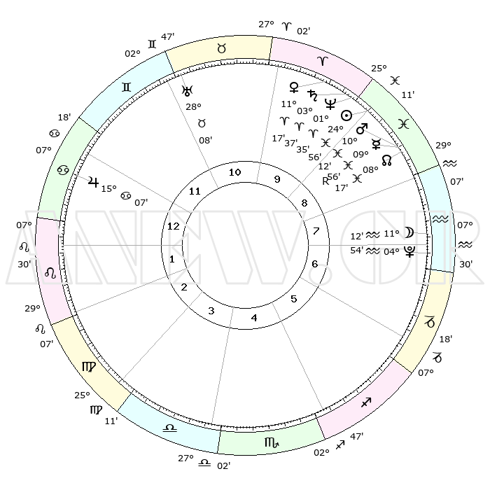 | | ΘΕΣΕΙΣ ΠΛΑΝΗΤΩΝ ΑΣΤΡΟΛΟΓΙΚΟΥ ΧΑΡΤΗ ΤΗΣ ΣΤΙΓΜΗΣ ΑΥΤΗΣ | | | | Πλανήτης | Ζώδιο | Μοίρες | Δεκαήμ. | Σε οίκο | Απόκλιση | | Ακμές των οίκων | | Ηλιος | Ιχθείς | 25°24' | Τρίτο | 3 | 01 S 50 | | 1ος | 22°26' | Τοξότης | | Σελήνη | Υδροχόος | 17°05' | Δεύτερο | 2 | 17 S 35 | | 2ος | 27°45' | Αιγόκερως | | Ερμής | Ιχθείς | 09°42'R | Πρώτο | 3 | 05 S 55 | | 3ος | 07°00' | Ιχθείς | | Αφροδίτη | Κριός | 11°51' | Δεύτερο | 3 | 03 N 45 | | 4ος | 12°00' | Κριός | | Αρης | Ιχθείς | 10°33' | Δεύτερο | 3 | 08 S 37 | | 5ος | 09°34' | Ταύρος | | Δίας | Καρκίνος | 15°07' | Δεύτερο | 7 | 22 N 56 | | 6ος | 01°58' | Δίδυμοι | | Κρόνος | Κριός | 03°40' | Πρώτο | 3 | 00 S 30 | | 7ος | 22°26' | Δίδυμοι | | Ουρανός | Ταύρος | 28°09' | Τρίτο | 5 | 19 N 34 | | 8ος | 27°45' | Καρκίνος | | Ποσειδώνας | Κριός | 01°36' | Πρώτο | 3 | 00 S 34 | | 9ος | 07°00' | Παρθένος | | Πλούτωνας | Υδροχόος | 04°54' | Πρώτο | 2 | 22 S 49 | | 10ος | 12°00' | Ζυγός | | Β. Δεσμός | Ιχθείς | 08°15' | Πρώτο | 3 | 08 S 28 | | 11ος | 09°34' | Σκορπιός | | Ωροσκόπος | Τοξότης | 22°26' | Τρίτο | | | 12ος | 01°58' | Τοξότης | | Μεσουράνημα | Ζυγός | 12°00' | Δεύτερο | | | |