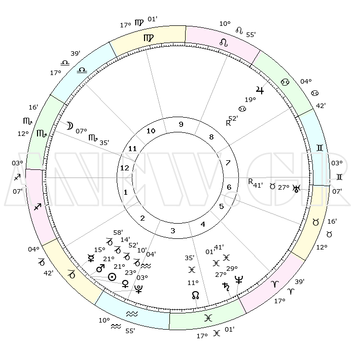 | | ΘΕΣΕΙΣ ΠΛΑΝΗΤΩΝ ΑΣΤΡΟΛΟΓΙΚΟΥ ΧΑΡΤΗ ΤΗΣ ΣΤΙΓΜΗΣ ΑΥΤΗΣ | | | | Πλανήτης | Ζώδιο | Μοίρες | Δεκαήμ. | Σε οίκο | Απόκλιση | | Ακμές των οίκων | | Ηλιος | Αιγόκερως | 21°48' | Τρίτο | 3 | 21 S 40 | | 1ος | 12°56' | Σκορπιός | | Σελήνη | Σκορπιός | 06°46' | Πρώτο | 12 | 17 S 48 | | 2ος | 12°14' | Τοξότης | | Ερμής | Αιγόκερως | 15°51' | Δεύτερο | 3 | 24 S 04 | | 3ος | 15°28' | Αιγόκερως | | Αφροδίτη | Αιγόκερως | 23°05' | Τρίτο | 3 | 22 S 20 | | 4ος | 20°35' | Υδροχόος | | Αρης | Αιγόκερως | 21°11' | Τρίτο | 3 | 22 S 43 | | 5ος | 23°07' | Ιχθείς | | Δίας | Καρκίνος | 19°53'R | Δεύτερο | 9 | 22 N 13 | | 6ος | 20°25' | Κριός | | Κρόνος | Ιχθείς | 27°01' | Τρίτο | 5 | 03 S 14 | | 7ος | 12°56' | Ταύρος | | Ουρανός | Ταύρος | 27°41'R | Τρίτο | 7 | 19 N 27 | | 8ος | 12°14' | Δίδυμοι | | Ποσειδώνας | Ιχθείς | 29°41' | Τρίτο | 5 | 01 S 21 | | 9ος | 15°28' | Καρκίνος | | Πλούτωνας | Υδροχόος | 03°04' | Πρώτο | 3 | 23 S 09 | | 10ος | 20°35' | Λέων | | Β. Δεσμός | Ιχθείς | 11°35' | Δεύτερο | 4 | 07 S 13 | | 11ος | 23°07' | Παρθένος | | Ωροσκόπος | Σκορπιός | 12°56' | Δεύτερο | | | 12ος | 20°25' | Ζυγός | | Μεσουράνημα | Λέων | 20°35' | Τρίτο | | | |