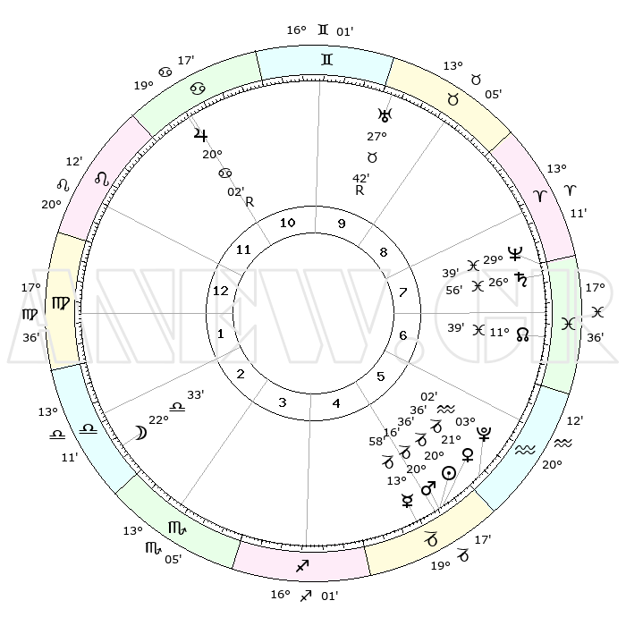 | | ΘΕΣΕΙΣ ΠΛΑΝΗΤΩΝ ΑΣΤΡΟΛΟΓΙΚΟΥ ΧΑΡΤΗ ΤΗΣ ΣΤΙΓΜΗΣ ΑΥΤΗΣ | | | | Πλανήτης | Ζώδιο | Μοίρες | Δεκαήμ. | Σε οίκο | Απόκλιση | | Ακμές των οίκων | | Ηλιος | Αιγόκερως | 19°50' | Δεύτερο | 2 | 21 S 58 | | 1ος | 00°30' | Τοξότης | | Σελήνη | Ζυγός | 13°28' | Δεύτερο | 10 | 07 S 54 | | 2ος | 01°42' | Αιγόκερως | | Ερμής | Αιγόκερως | 12°47' | Δεύτερο | 2 | 24 S 15 | | 3ος | 07°29' | Υδροχόος | | Αφροδίτη | Αιγόκερως | 20°39' | Τρίτο | 2 | 22 S 40 | | 4ος | 13°32' | Ιχθείς | | Αρης | Αιγόκερως | 19°41' | Δεύτερο | 2 | 22 S 55 | | 5ος | 14°30' | Κριός | | Δίας | Καρκίνος | 20°08'R | Τρίτο | 8 | 22 N 11 | | 6ος | 09°29' | Ταύρος | | Κρόνος | Ιχθείς | 26°53' | Τρίτο | 4 | 03 S 17 | | 7ος | 00°30' | Δίδυμοι | | Ουρανός | Ταύρος | 27°43'R | Τρίτο | 6 | 19 N 27 | | 8ος | 01°42' | Καρκίνος | | Ποσειδώνας | Ιχθείς | 29°39' | Τρίτο | 4 | 01 S 22 | | 9ος | 07°29' | Λέων | | Πλούτωνας | Υδροχόος | 03°00' | Πρώτο | 2 | 23 S 10 | | 10ος | 13°32' | Παρθένος | | Β. Δεσμός | Ιχθείς | 11°41' | Δεύτερο | 3 | 07 S 11 | | 11ος | 14°30' | Ζυγός | | Ωροσκόπος | Τοξότης | 00°30' | Πρώτο | | | 12ος | 09°29' | Σκορπιός | | Μεσουράνημα | Παρθένος | 13°32' | Δεύτερο | | | |