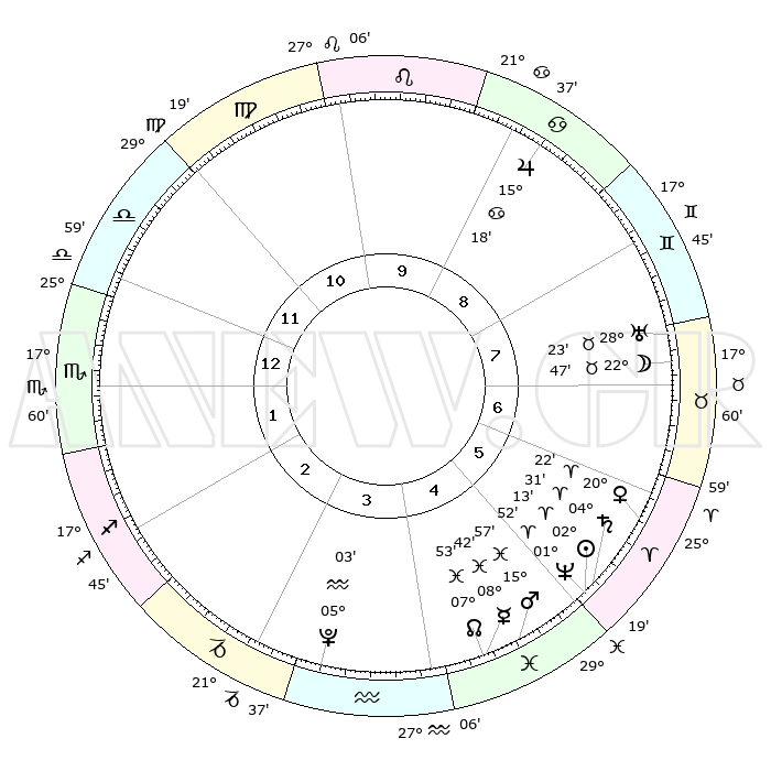 | | ΘΕΣΕΙΣ ΠΛΑΝΗΤΩΝ ΑΣΤΡΟΛΟΓΙΚΟΥ ΧΑΡΤΗ ΤΗΣ ΣΤΙΓΜΗΣ ΑΥΤΗΣ | | | | Πλανήτης | Ζώδιο | Μοίρες | Δεκαήμ. | Σε οίκο | Απόκλιση | | Ακμές των οίκων | | Ηλιος | Κριός | 02°09' | Πρώτο | 5 | 00 N 51 | | 1ος | 27°03' | Ζυγός | | Σελήνη | Ταύρος | 21°44' | Τρίτο | 7 | 23 N 01 | | 2ος | 25°17' | Σκορπιός | | Ερμής | Ιχθείς | 08°41' | Πρώτο | 5 | 07 S 50 | | 3ος | 27°01' | Τοξότης | | Αφροδίτη | Κριός | 20°16' | Τρίτο | 6 | 07 N 11 | | 4ος | 01°01' | Υδροχόος | | Αρης | Ιχθείς | 15°54' | Δεύτερο | 5 | 06 S 33 | | 5ος | 03°58' | Ιχθείς | | Δίας | Καρκίνος | 15°18' | Δεύτερο | 9 | 22 N 55 | | 6ος | 02°53' | Κριός | | Κρόνος | Κριός | 04°31' | Πρώτο | 6 | 00 S 10 | | 7ος | 27°03' | Κριός | | Ουρανός | Ταύρος | 28°23' | Τρίτο | 8 | 19 N 38 | | 8ος | 25°17' | Ταύρος | | Ποσειδώνας | Κριός | 01°52' | Πρώτο | 5 | 00 S 28 | | 9ος | 27°01' | Δίδυμοι | | Πλούτωνας | Υδροχόος | 05°03' | Πρώτο | 4 | 22 S 48 | | 10ος | 01°01' | Λέων | | Β. Δεσμός | Ιχθείς | 07°54' | Πρώτο | 5 | 08 S 36 | | 11ος | 03°58' | Παρθένος | | Ωροσκόπος | Ζυγός | 27°03' | Τρίτο | | | 12ος | 02°53' | Ζυγός | | Μεσουράνημα | Λέων | 01°01' | Πρώτο | | | |