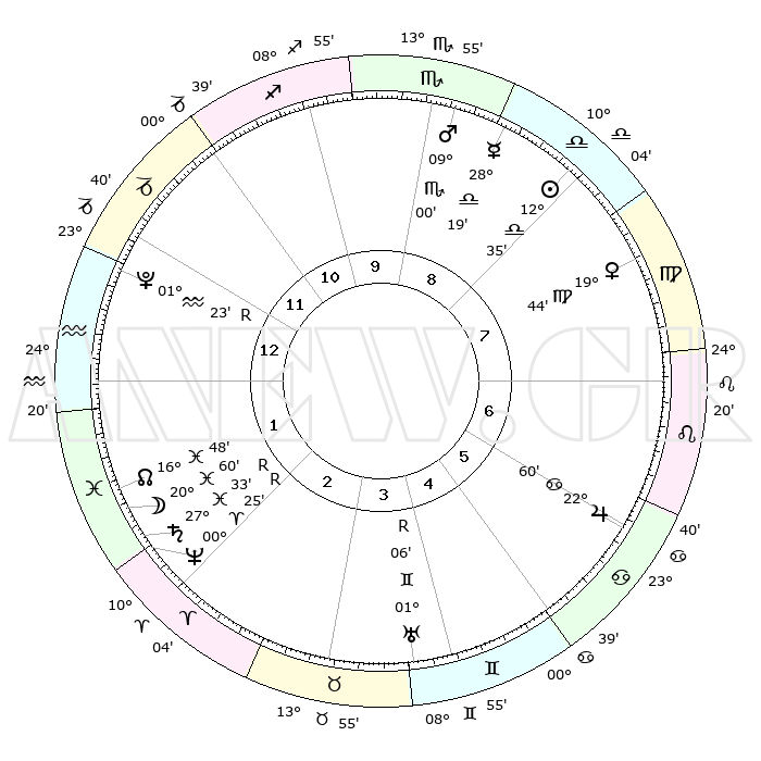 | ΘΕΣΕΙΣ ΠΛΑΝΗΤΩΝ ΑΣΤΡΟΛΟΓΙΚΟΥ ΧΑΡΤΗ ΤΗΣ ΣΤΙΓΜΗΣ ΑΥΤΗΣ | | Πλανήτης | Ζώδιο | Μοίρες | Δεκαήμ. | Σε οίκο | Απόκλιση | | Ακμές των οίκων | Ηλιος | Ζυγός | 12°29' | Δεύτερο | 9 | 04 S 56 | | 1ος | 07°53' | Αιγόκερως | Σελήνη | Ιχθείς | 19°26' | Δεύτερο | 2 | 04 S 05 | | 2ος | 17°04' | Υδροχόος | Ερμής | Ζυγός | 28°09' | Τρίτο | 9 | 11 S 25 | | 3ος | 27°22' | Ιχθείς | Αφροδίτη | Παρθένος | 19°36' | Δεύτερο | 8 | 05 N 24 | | 4ος | 29°56' | Κριός | Αρης | Σκορπιός | 08°56' | Πρώτο | 10 | 14 S 35 | | 5ος | 25°04' | Ταύρος | Δίας | Καρκίνος | 22°59' | Τρίτο | 7 | 21 N 30 | | 6ος | 16°28' | Δίδυμοι | Κρόνος | Ιχθείς | 27°33'R | Τρίτο | 3 | 03 S 17 | | 7ος | 07°53' | Καρκίνος | Ουρανός | Δίδυμοι | 01°06'R | Πρώτο | 5 | 20 N 10 | | 8ος | 17°04' | Λέων | Ποσειδώνας | Κριός | 00°26'R | Πρώτο | 3 | 01 S 06 | | 9ος | 27°22' | Παρθένος | Πλούτωνας | Υδροχόος | 01°23'R | Πρώτο | 1 | 23 S 32 | | 10ος | 29°56' | Ζυγός | Β. Δεσμός | Ιχθείς | 16°48' | Δεύτερο | 2 | 05 S 12 | | 11ος | 25°04' | Σκορπιός | Ωροσκόπος | Αιγόκερως | 07°53' | Πρώτο | | | 12ος | 16°28' | Τοξότης | Μεσουράνημα | Ζυγός | 29°56' | Τρίτο | | | |