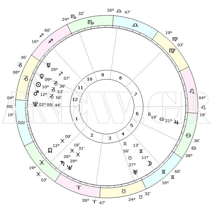 | | ΘΕΣΕΙΣ ΠΛΑΝΗΤΩΝ ΑΣΤΡΟΛΟΓΙΚΟΥ ΧΑΡΤΗ ΤΗΣ ΣΤΙΓΜΗΣ ΑΥΤΗΣ | | | | Πλανήτης | Ζώδιο | Μοίρες | Δεκαήμ. | Σε οίκο | Απόκλιση | | Ακμές των οίκων | | Ηλιος | Αιγόκερως | 10°48' | Δεύτερο | 1 | 23 S 00 | | 1ος | 07°24' | Αιγόκερως | | Σελήνη | Δίδυμοι | 10°11' | Δεύτερο | 5 | 26 N 59 | | 2ος | 16°27' | Υδροχόος | | Ερμής | Τοξότης | 29°01' | Τρίτο | 12 | 24 S 01 | | 3ος | 26°45' | Ιχθείς | | Αφροδίτη | Αιγόκερως | 09°31' | Πρώτο | 1 | 23 S 36 | | 4ος | 29°25' | Κριός | | Αρης | Αιγόκερως | 12°53' | Δεύτερο | 1 | 23 S 42 | | 5ος | 24°37' | Ταύρος | | Δίας | Καρκίνος | 21°19'R | Τρίτο | 7 | 21 N 59 | | 6ος | 16°02' | Δίδυμοι | | Κρόνος | Ιχθείς | 26°18' | Τρίτο | 2 | 03 S 33 | | 7ος | 07°24' | Καρκίνος | | Ουρανός | Ταύρος | 27°56'R | Τρίτο | 5 | 19 N 30 | | 8ος | 16°27' | Λέων | | Ποσειδώνας | Ιχθείς | 29°31' | Τρίτο | 3 | 01 S 25 | | 9ος | 26°45' | Παρθένος | | Πλούτωνας | Υδροχόος | 02°44' | Πρώτο | 1 | 23 S 13 | | 10ος | 29°25' | Ζυγός | | Β. Δεσμός | Ιχθείς | 12°09' | Δεύτερο | 2 | 07 S 00 | | 11ος | 24°37' | Σκορπιός | | Ωροσκόπος | Αιγόκερως | 07°24' | Πρώτο | | | 12ος | 16°02' | Τοξότης | | Μεσουράνημα | Ζυγός | 29°25' | Τρίτο | | | |