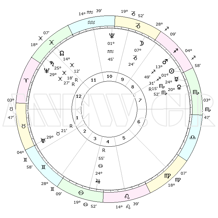 | | ΘΕΣΕΙΣ ΠΛΑΝΗΤΩΝ ΑΣΤΡΟΛΟΓΙΚΟΥ ΧΑΡΤΗ ΤΗΣ ΣΤΙΓΜΗΣ ΑΥΤΗΣ | | | | Πλανήτης | Ζώδιο | Μοίρες | Δεκαήμ. | Σε οίκο | Απόκλιση | | Ακμές των οίκων | | Ηλιος | Τοξότης | 01°27' | Πρώτο | 8 | 20 S 27 | | 1ος | 26°12' | Ιχθείς | | Σελήνη | Αιγόκερως | 06°36' | Πρώτο | 10 | 27 S 55 | | 2ος | 07°23' | Ταύρος | | Ερμής | Σκορπιός | 24°20'R | Τρίτο | 8 | 17 S 23 | | 3ος | 05°23' | Δίδυμοι | | Αφροδίτη | Σκορπιός | 20°47' | Τρίτο | 8 | 17 S 01 | | 4ος | 27°52' | Δίδυμοι | | Αρης | Τοξότης | 13°46' | Δεύτερο | 9 | 23 S 03 | | 5ος | 20°01' | Καρκίνος | | Δίας | Καρκίνος | 24°55'R | Τρίτο | 5 | 21 N 17 | | 6ος | 16°51' | Λέων | | Κρόνος | Ιχθείς | 25°18'R | Τρίτο | 12 | 04 S 04 | | 7ος | 26°12' | Παρθένος | | Ουρανός | Ταύρος | 29°21'R | Τρίτο | 2 | 19 N 48 | | 8ος | 07°23' | Σκορπιός | | Ποσειδώνας | Ιχθείς | 29°27'R | Τρίτο | 1 | 01 S 28 | | 9ος | 05°23' | Τοξότης | | Πλούτωνας | Υδροχόος | 01°45' | Πρώτο | 11 | 23 S 26 | | 10ος | 27°52' | Τοξότης | | Β. Δεσμός | Ιχθείς | 14°12' | Δεύτερο | 12 | 06 S 13 | | 11ος | 20°01' | Αιγόκερως | | Ωροσκόπος | Ιχθείς | 26°12' | Τρίτο | | | 12ος | 16°51' | Υδροχόος | | Μεσουράνημα | Τοξότης | 27°52' | Τρίτο | | | |