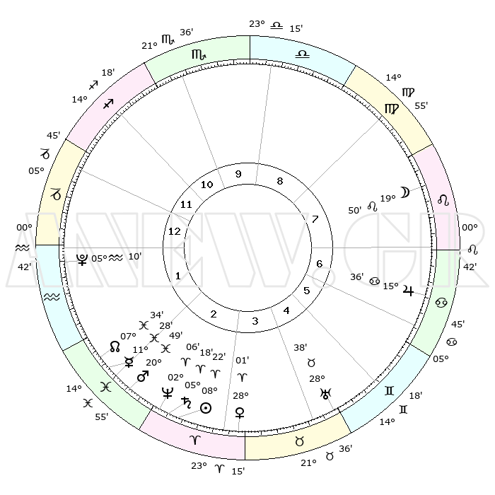 | | ΘΕΣΕΙΣ ΠΛΑΝΗΤΩΝ ΑΣΤΡΟΛΟΓΙΚΟΥ ΧΑΡΤΗ ΤΗΣ ΣΤΙΓΜΗΣ ΑΥΤΗΣ | | | | Πλανήτης | Ζώδιο | Μοίρες | Δεκαήμ. | Σε οίκο | Απόκλιση | | Ακμές των οίκων | | Ηλιος | Κριός | 08°19' | Πρώτο | 3 | 03 N 18 | | 1ος | 09°23' | Αιγόκερως | | Σελήνη | Λέων | 19°06' | Δεύτερο | 8 | 16 N 46 | | 2ος | 18°56' | Υδροχόος | | Ερμής | Ιχθείς | 11°25' | Δεύτερο | 2 | 08 S 01 | | 3ος | 29°14' | Ιχθείς | | Αφροδίτη | Κριός | 27°57' | Τρίτο | 3 | 10 N 13 | | 4ος | 01°31' | Ταύρος | | Αρης | Ιχθείς | 20°47' | Τρίτο | 2 | 04 S 37 | | 5ος | 26°27' | Ταύρος | | Δίας | Καρκίνος | 15°36' | Δεύτερο | 7 | 22 N 53 | | 6ος | 17°48' | Δίδυμοι | | Κρόνος | Κριός | 05°17' | Πρώτο | 3 | 00 N 09 | | 7ος | 09°23' | Καρκίνος | | Ουρανός | Ταύρος | 28°38' | Τρίτο | 5 | 19 N 41 | | 8ος | 18°56' | Λέων | | Ποσειδώνας | Κριός | 02°06' | Πρώτο | 3 | 00 S 22 | | 9ος | 29°14' | Παρθένος | | Πλούτωνας | Υδροχόος | 05°10' | Πρώτο | 1 | 22 S 48 | | 10ος | 01°32' | Σκορπιός | | Β. Δεσμός | Ιχθείς | 07°34' | Πρώτο | 2 | 08 S 44 | | 11ος | 26°27' | Σκορπιός | | Ωροσκόπος | Αιγόκερως | 09°23' | Πρώτο | | | 12ος | 17°48' | Τοξότης | | Μεσουράνημα | Σκορπιός | 01°32' | Πρώτο | | | |