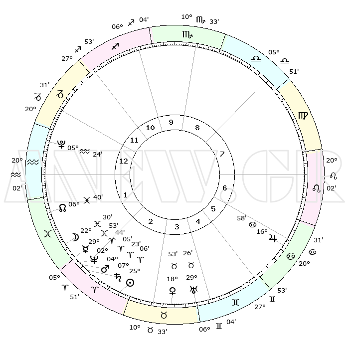 | | ΘΕΣΕΙΣ ΠΛΑΝΗΤΩΝ ΑΣΤΡΟΛΟΓΙΚΟΥ ΧΑΡΤΗ ΤΗΣ ΣΤΙΓΜΗΣ ΑΥΤΗΣ | | | | Πλανήτης | Ζώδιο | Μοίρες | Δεκαήμ. | Σε οίκο | Απόκλιση | | Ακμές των οίκων | | Ηλιος | Κριός | 25°03' | Τρίτο | 3 | 09 N 41 | | 1ος | 24°52' | Αιγόκερως | | Σελήνη | Ιχθείς | 21°44' | Τρίτο | 2 | 02 S 10 | | 2ος | 08°02' | Ιχθείς | | Ερμής | Ιχθείς | 29°48' | Τρίτο | 2 | 02 S 27 | | 3ος | 17°13' | Κριός | | Αφροδίτη | Ταύρος | 18°49' | Δεύτερο | 4 | 17 N 35 | | 4ος | 16°35' | Ταύρος | | Αρης | Κριός | 04°02' | Πρώτο | 2 | 00 N 42 | | 5ος | 09°46' | Δίδυμοι | | Δίας | Καρκίνος | 16°58' | Δεύτερο | 6 | 22 N 44 | | 6ος | 01°02' | Καρκίνος | | Κρόνος | Κριός | 07°23' | Πρώτο | 2 | 00 N 58 | | 7ος | 24°52' | Καρκίνος | | Ουρανός | Ταύρος | 29°25' | Τρίτο | 4 | 19 N 51 | | 8ος | 08°02' | Παρθένος | | Ποσειδώνας | Κριός | 02°43' | Πρώτο | 2 | 00 S 07 | | 9ος | 17°13' | Ζυγός | | Πλούτωνας | Υδροχόος | 05°24' | Πρώτο | 1 | 22 S 47 | | 10ος | 16°35' | Σκορπιός | | Β. Δεσμός | Ιχθείς | 06°40' | Πρώτο | 1 | 09 S 04 | | 11ος | 09°46' | Τοξότης | | Ωροσκόπος | Αιγόκερως | 24°52' | Τρίτο | | | 12ος | 01°02' | Αιγόκερως | | Μεσουράνημα | Σκορπιός | 16°35' | Δεύτερο | | | |