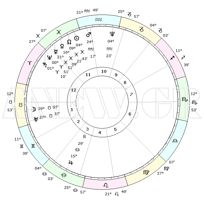 | | ΘΕΣΕΙΣ ΠΛΑΝΗΤΩΝ ΑΣΤΡΟΛΟΓΙΚΟΥ ΧΑΡΤΗ ΤΗΣ ΣΤΙΓΜΗΣ ΑΥΤΗΣ | | | | Πλανήτης | Ζώδιο | Μοίρες | Δεκαήμ. | Σε οίκο | Απόκλιση | | Ακμές των οίκων | | Ηλιος | Ιχθείς | 04°38' | Πρώτο | 12 | 09 S 48 | | 1ος | 29°47' | Ιχθείς | | Σελήνη | Ταύρος | 18°01' | Δεύτερο | 2 | 21 N 56 | | 2ος | 10°08' | Ταύρος | | Ερμής | Ιχθείς | 21°49' | Τρίτο | 12 | 01 S 20 | | 3ος | 07°34' | Δίδυμοι | | Αφροδίτη | Ιχθείς | 16°04' | Δεύτερο | 12 | 06 S 49 | | 4ος | 29°53' | Δίδυμοι | | Αρης | Υδροχόος | 24°14' | Τρίτο | 12 | 14 S 28 | | 5ος | 22°10' | Καρκίνος | | Δίας | Καρκίνος | 15°30'R | Δεύτερο | 4 | 22 N 52 | | 6ος | 19°32' | Λέων | | Κρόνος | Κριός | 01°10' | Πρώτο | 1 | 01 S 30 | | 7ος | 29°47' | Παρθένος | | Ουρανός | Ταύρος | 27°37' | Τρίτο | 2 | 19 N 27 | | 8ος | 10°08' | Σκορπιός | | Ποσειδώνας | Κριός | 00°51' | Πρώτο | 1 | 00 S 52 | | 9ος | 07°34' | Τοξότης | | Πλούτωνας | Υδροχόος | 04°23' | Πρώτο | 11 | 22 S 54 | | 10ος | 29°53' | Τοξότης | | Β. Δεσμός | Ιχθείς | 09°21' | Πρώτο | 12 | 08 S 04 | | 11ος | 22°10' | Αιγόκερως | | Ωροσκόπος | Ιχθείς | 29°47' | Τρίτο | | | 12ος | 19°32' | Υδροχόος | | Μεσουράνημα | Τοξότης | 29°53' | Τρίτο | | | |