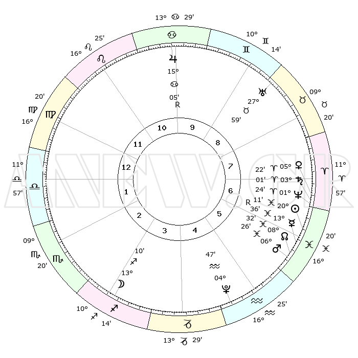 | | ΘΕΣΕΙΣ ΠΛΑΝΗΤΩΝ ΑΣΤΡΟΛΟΓΙΚΟΥ ΧΑΡΤΗ ΤΗΣ ΣΤΙΓΜΗΣ ΑΥΤΗΣ | | | | Πλανήτης | Ζώδιο | Μοίρες | Δεκαήμ. | Σε οίκο | Απόκλιση | | Ακμές των οίκων | | Ηλιος | Ιχθείς | 20°03' | Τρίτο | 7 | 03 S 56 | | 1ος | 04°22' | Παρθένος | | Σελήνη | Τοξότης | 11°39' | Δεύτερο | 4 | 27 S 24 | | 2ος | 28°41' | Παρθένος | | Ερμής | Ιχθείς | 13°43'R | Δεύτερο | 7 | 03 S 22 | | 3ος | 27°43' | Ζυγός | | Αφροδίτη | Κριός | 05°13' | Πρώτο | 8 | 01 N 00 | | 4ος | 00°40' | Τοξότης | | Αρης | Ιχθείς | 06°20' | Πρώτο | 7 | 10 S 12 | | 5ος | 04°35' | Αιγόκερως | | Δίας | Καρκίνος | 15°05'R | Δεύτερο | 11 | 22 N 56 | | 6ος | 06°13' | Υδροχόος | | Κρόνος | Κριός | 03°00' | Πρώτο | 8 | 00 S 45 | | 7ος | 04°22' | Ιχθείς | | Ουρανός | Ταύρος | 27°59' | Τρίτο | 9 | 19 N 32 | | 8ος | 28°41' | Ιχθείς | | Ποσειδώνας | Κριός | 01°24' | Πρώτο | 8 | 00 S 38 | | 9ος | 27°43' | Κριός | | Πλούτωνας | Υδροχόος | 04°47' | Πρώτο | 5 | 22 S 50 | | 10ος | 00°40' | Δίδυμοι | | Β. Δεσμός | Ιχθείς | 08°32' | Πρώτο | 7 | 08 S 22 | | 11ος | 04°35' | Καρκίνος | | Ωροσκόπος | Παρθένος | 04°22' | Πρώτο | | | 12ος | 06°13' | Λέων | | Μεσουράνημα | Δίδυμοι | 00°40' | Πρώτο | | | |