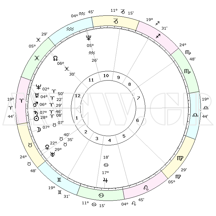 | | ΘΕΣΕΙΣ ΠΛΑΝΗΤΩΝ ΑΣΤΡΟΛΟΓΙΚΟΥ ΧΑΡΤΗ ΤΗΣ ΣΤΙΓΜΗΣ ΑΥΤΗΣ | | | | Πλανήτης | Ζώδιο | Μοίρες | Δεκαήμ. | Σε οίκο | Απόκλιση | | Ακμές των οίκων | | Ηλιος | Κριός | 28°04' | Τρίτο | 2 | 10 N 47 | | 1ος | 11°17' | Ιχθείς | | Σελήνη | Ταύρος | 06°08' | Πρώτο | 2 | 17 N 40 | | 2ος | 25°22' | Κριός | | Ερμής | Κριός | 04°16' | Πρώτο | 1 | 00 S 43 | | 3ος | 25°56' | Ταύρος | | Αφροδίτη | Ταύρος | 22°35' | Τρίτο | 2 | 18 N 43 | | 4ος | 19°21' | Δίδυμοι | | Αρης | Κριός | 06°26' | Πρώτο | 1 | 01 N 40 | | 5ος | 11°06' | Καρκίνος | | Δίας | Καρκίνος | 17°18' | Δεύτερο | 5 | 22 N 42 | | 6ος | 05°55' | Λέων | | Κρόνος | Κριός | 07°45' | Πρώτο | 1 | 01 N 06 | | 7ος | 11°17' | Παρθένος | | Ουρανός | Ταύρος | 29°35' | Τρίτο | 3 | 19 N 54 | | 8ος | 25°22' | Ζυγός | | Ποσειδώνας | Κριός | 02°50' | Πρώτο | 1 | 00 S 05 | | 9ος | 25°56' | Σκορπιός | | Πλούτωνας | Υδροχόος | 05°26' | Πρώτο | 11 | 22 S 47 | | 10ος | 19°21' | Τοξότης | | Β. Δεσμός | Ιχθείς | 06°30' | Πρώτο | 12 | 09 S 07 | | 11ος | 11°06' | Αιγόκερως | | Ωροσκόπος | Ιχθείς | 11°17' | Δεύτερο | | | 12ος | 05°55' | Υδροχόος | | Μεσουράνημα | Τοξότης | 19°21' | Δεύτερο | | | |