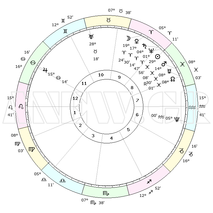 | | ΘΕΣΕΙΣ ΠΛΑΝΗΤΩΝ ΑΣΤΡΟΛΟΓΙΚΟΥ ΧΑΡΤΗ ΤΗΣ ΣΤΙΓΜΗΣ ΑΥΤΗΣ | | | | Πλανήτης | Ζώδιο | Μοίρες | Δεκαήμ. | Σε οίκο | Απόκλιση | | Ακμές των οίκων | | Ηλιος | Ιχθείς | 29°51' | Τρίτο | 9 | 00 S 03 | | 1ος | 23°37' | Καρκίνος | | Σελήνη | Κριός | 18°19' | Δεύτερο | 10 | 10 N 16 | | 2ος | 14°18' | Λέων | | Ερμής | Ιχθείς | 08°30'R | Πρώτο | 8 | 07 S 23 | | 3ος | 08°30' | Παρθένος | | Αφροδίτη | Κριός | 17°24' | Δεύτερο | 10 | 06 N 01 | | 4ος | 08°40' | Ζυγός | | Αρης | Ιχθείς | 14°05' | Δεύτερο | 9 | 07 S 15 | | 5ος | 14°45' | Σκορπιός | | Δίας | Καρκίνος | 15°14' | Δεύτερο | 12 | 22 N 55 | | 6ος | 21°31' | Τοξότης | | Κρόνος | Κριός | 04°13' | Πρώτο | 9 | 00 S 16 | | 7ος | 23°37' | Αιγόκερως | | Ουρανός | Ταύρος | 28°18' | Τρίτο | 11 | 19 N 36 | | 8ος | 14°18' | Υδροχόος | | Ποσειδώνας | Κριός | 01°46' | Πρώτο | 9 | 00 S 30 | | 9ος | 08°30' | Ιχθείς | | Πλούτωνας | Υδροχόος | 05°00' | Πρώτο | 7 | 22 S 49 | | 10ος | 08°40' | Κριός | | Β. Δεσμός | Ιχθείς | 08°01' | Πρώτο | 8 | 08 S 34 | | 11ος | 14°45' | Ταύρος | | Ωροσκόπος | Καρκίνος | 23°37' | Τρίτο | | | 12ος | 21°31' | Δίδυμοι | | Μεσουράνημα | Κριός | 08°40' | Πρώτο | | | |