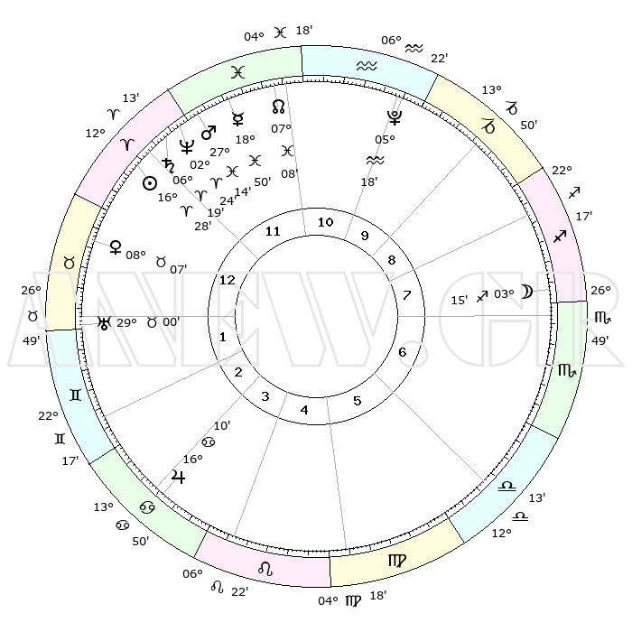 | | ΘΕΣΕΙΣ ΠΛΑΝΗΤΩΝ ΑΣΤΡΟΛΟΓΙΚΟΥ ΧΑΡΤΗ ΤΗΣ ΣΤΙΓΜΗΣ ΑΥΤΗΣ | | | | Πλανήτης | Ζώδιο | Μοίρες | Δεκαήμ. | Σε οίκο | Απόκλιση | | Ακμές των οίκων | | Ηλιος | Κριός | 16°24' | Δεύτερο | 12 | 06 N 27 | | 1ος | 24°20' | Κριός | | Σελήνη | Τοξότης | 02°28' | Πρώτο | 8 | 25 S 41 | | 2ος | 28°08' | Ταύρος | | Ερμής | Ιχθείς | 18°45' | Δεύτερο | 12 | 06 S 17 | | 3ος | 22°18' | Δίδυμοι | | Αφροδίτη | Ταύρος | 08°02' | Πρώτο | 1 | 13 N 58 | | 4ος | 13°59' | Καρκίνος | | Αρης | Ιχθείς | 27°11' | Τρίτο | 12 | 02 S 04 | | 5ος | 07°52' | Λέων | | Δίας | Καρκίνος | 16°09' | Δεύτερο | 4 | 22 N 50 | | 6ος | 09°29' | Παρθένος | | Κρόνος | Κριός | 06°18' | Πρώτο | 12 | 00 N 33 | | 7ος | 24°20' | Ζυγός | | Ουρανός | Ταύρος | 28°60' | Τρίτο | 2 | 19 N 46 | | 8ος | 28°08' | Σκορπιός | | Ποσειδώνας | Κριός | 02°24' | Πρώτο | 12 | 00 S 15 | | 9ος | 22°18' | Τοξότης | | Πλούτωνας | Υδροχόος | 05°18' | Πρώτο | 10 | 22 S 47 | | 10ος | 13°59' | Αιγόκερως | | Β. Δεσμός | Ιχθείς | 07°08' | Πρώτο | 11 | 08 S 53 | | 11ος | 07°52' | Υδροχόος | | Ωροσκόπος | Κριός | 24°20' | Τρίτο | | | 12ος | 09°29' | Ιχθείς | | Μεσουράνημα | Αιγόκερως | 13°59' | Δεύτερο | | | |