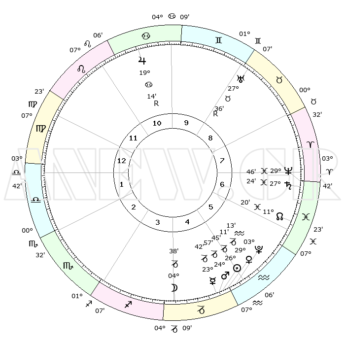 | | ΘΕΣΕΙΣ ΠΛΑΝΗΤΩΝ ΑΣΤΡΟΛΟΓΙΚΟΥ ΧΑΡΤΗ ΤΗΣ ΣΤΙΓΜΗΣ ΑΥΤΗΣ | | | | Πλανήτης | Ζώδιο | Μοίρες | Δεκαήμ. | Σε οίκο | Απόκλιση | | Ακμές των οίκων | | Ηλιος | Αιγόκερως | 26°40' | Τρίτο | 5 | 20 S 49 | | 1ος | 10°47' | Παρθένος | | Σελήνη | Αιγόκερως | 03°41' | Πρώτο | 4 | 28 S 04 | | 2ος | 05°44' | Ζυγός | | Ερμής | Αιγόκερως | 23°34' | Τρίτο | 5 | 23 S 14 | | 3ος | 05°15' | Σκορπιός | | Αφροδίτη | Αιγόκερως | 29°05' | Τρίτο | 5 | 21 S 21 | | 4ος | 08°12' | Τοξότης | | Αρης | Αιγόκερως | 24°53' | Τρίτο | 5 | 22 S 07 | | 5ος | 11°45' | Αιγόκερως | | Δίας | Καρκίνος | 19°14'R | Δεύτερο | 11 | 22 N 20 | | 6ος | 12°60' | Υδροχόος | | Κρόνος | Ιχθείς | 27°23' | Τρίτο | 7 | 03 S 04 | | 7ος | 10°47' | Ιχθείς | | Ουρανός | Ταύρος | 27°36'R | Τρίτο | 9 | 19 N 26 | | 8ος | 05°44' | Κριός | | Ποσειδώνας | Ιχθείς | 29°46' | Τρίτο | 7 | 01 S 18 | | 9ος | 05°15' | Ταύρος | | Πλούτωνας | Υδροχόος | 03°13' | Πρώτο | 5 | 23 S 07 | | 10ος | 08°12' | Δίδυμοι | | Β. Δεσμός | Ιχθείς | 11°20' | Δεύτερο | 7 | 07 S 19 | | 11ος | 11°45' | Καρκίνος | | Ωροσκόπος | Παρθένος | 10°47' | Δεύτερο | | | 12ος | 12°60' | Λέων | | Μεσουράνημα | Δίδυμοι | 08°12' | Πρώτο | | | |