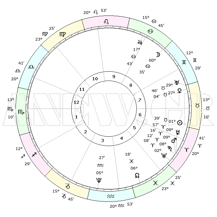 | | ΘΕΣΕΙΣ ΠΛΑΝΗΤΩΝ ΑΣΤΡΟΛΟΓΙΚΟΥ ΧΑΡΤΗ ΤΗΣ ΣΤΙΓΜΗΣ ΑΥΤΗΣ | | | | Πλανήτης | Ζώδιο | Μοίρες | Δεκαήμ. | Σε οίκο | Απόκλιση | | Ακμές των οίκων | | Ηλιος | Ταύρος | 01°35' | Πρώτο | 7 | 12 N 01 | | 1ος | 22°59' | Ζυγός | | Σελήνη | Δίδυμοι | 29°34' | Τρίτο | 9 | 28 N 09 | | 2ος | 20°59' | Σκορπιός | | Ερμής | Κριός | 09°51' | Πρώτο | 6 | 01 N 31 | | 3ος | 22°27' | Τοξότης | | Αφροδίτη | Ταύρος | 26°59' | Τρίτο | 8 | 19 N 57 | | 4ος | 26°12' | Αιγόκερως | | Αρης | Κριός | 09°13' | Πρώτο | 6 | 02 N 47 | | 5ος | 29°10' | Υδροχόος | | Δίας | Καρκίνος | 17°43' | Δεύτερο | 9 | 22 N 39 | | 6ος | 28°24' | Ιχθείς | | Κρόνος | Κριός | 08°11' | Πρώτο | 6 | 01 N 16 | | 7ος | 22°59' | Κριός | | Ουρανός | Ταύρος | 29°46' | Τρίτο | 8 | 19 N 56 | | 8ος | 20°59' | Ταύρος | | Ποσειδώνας | Κριός | 02°57' | Πρώτο | 6 | 00 S 02 | | 9ος | 22°27' | Δίδυμοι | | Πλούτωνας | Υδροχόος | 05°27' | Πρώτο | 4 | 22 S 48 | | 10ος | 26°12' | Καρκίνος | | Β. Δεσμός | Ιχθείς | 06°18' | Πρώτο | 5 | 09 S 12 | | 11ος | 29°10' | Λέων | | Ωροσκόπος | Ζυγός | 22°59' | Τρίτο | | | 12ος | 28°24' | Παρθένος | | Μεσουράνημα | Καρκίνος | 26°12' | Τρίτο | | | |