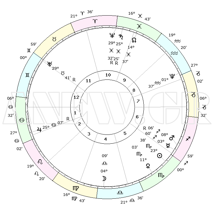 | | ΘΕΣΕΙΣ ΠΛΑΝΗΤΩΝ ΑΣΤΡΟΛΟΓΙΚΟΥ ΧΑΡΤΗ ΤΗΣ ΣΤΙΓΜΗΣ ΑΥΤΗΣ | | | | Πλανήτης | Ζώδιο | Μοίρες | Δεκαήμ. | Σε οίκο | Απόκλιση | | Ακμές των οίκων | | Ηλιος | Σκορπιός | 23°33' | Τρίτο | 6 | 18 S 39 | | 1ος | 08°16' | Δίδυμοι | | Σελήνη | Ζυγός | 03°10' | Πρώτο | 5 | 02 S 37 | | 2ος | 01°33' | Καρκίνος | | Ερμής | Τοξότης | 04°05'R | Πρώτο | 6 | 21 S 58 | | 3ος | 22°47' | Καρκίνος | | Αφροδίτη | Σκορπιός | 10°57' | Δεύτερο | 6 | 13 S 59 | | 4ος | 16°15' | Λέων | | Αρης | Τοξότης | 08°02' | Πρώτο | 6 | 22 S 10 | | 5ος | 16°12' | Παρθένος | | Δίας | Καρκίνος | 25°08'R | Τρίτο | 3 | 21 N 13 | | 6ος | 25°45' | Ζυγός | | Κρόνος | Ιχθείς | 25°25'R | Τρίτο | 11 | 04 S 03 | | 7ος | 08°16' | Τοξότης | | Ουρανός | Ταύρος | 29°41'R | Τρίτο | 12 | 19 N 53 | | 8ος | 01°33' | Αιγόκερως | | Ποσειδώνας | Ιχθείς | 29°33'R | Τρίτο | 11 | 01 S 26 | | 9ος | 22°47' | Αιγόκερως | | Πλούτωνας | Υδροχόος | 01°37' | Πρώτο | 9 | 23 S 28 | | 10ος | 16°15' | Υδροχόος | | Β. Δεσμός | Ιχθείς | 14°37' | Δεύτερο | 10 | 06 S 03 | | 11ος | 16°12' | Ιχθείς | | Ωροσκόπος | Δίδυμοι | 08°16' | Πρώτο | | | 12ος | 25°45' | Κριός | | Μεσουράνημα | Υδροχόος | 16°15' | Δεύτερο | | | |