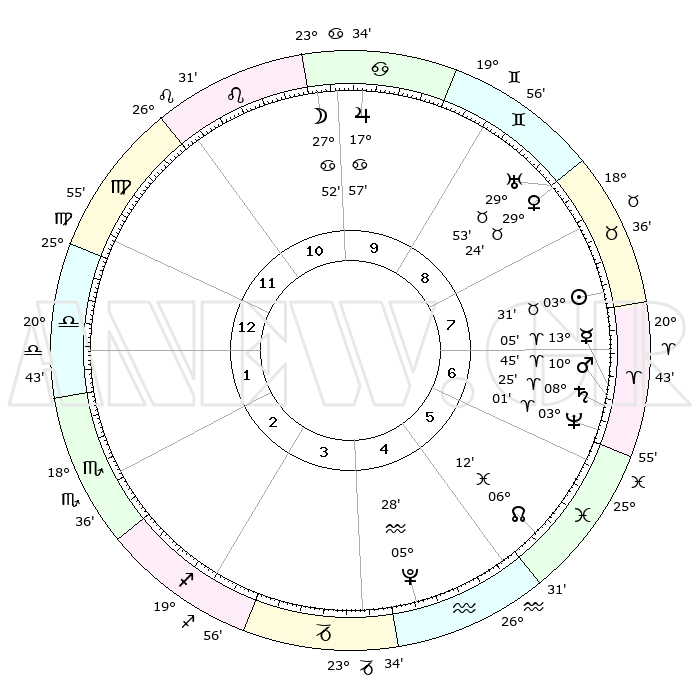 | | ΘΕΣΕΙΣ ΠΛΑΝΗΤΩΝ ΑΣΤΡΟΛΟΓΙΚΟΥ ΧΑΡΤΗ ΤΗΣ ΣΤΙΓΜΗΣ ΑΥΤΗΣ | | | | Πλανήτης | Ζώδιο | Μοίρες | Δεκαήμ. | Σε οίκο | Απόκλιση | | Ακμές των οίκων | | Ηλιος | Ταύρος | 03°28' | Πρώτο | 8 | 12 N 40 | | 1ος | 03°59' | Ζυγός | | Σελήνη | Καρκίνος | 27°05' | Τρίτο | 10 | 23 N 59 | | 2ος | 00°51' | Σκορπιός | | Ερμής | Κριός | 12°59' | Δεύτερο | 7 | 02 N 49 | | 3ος | 01°26' | Τοξότης | | Αφροδίτη | Ταύρος | 29°20' | Τρίτο | 8 | 20 N 33 | | 4ος | 04°28' | Αιγόκερως | | Αρης | Κριός | 10°42' | Δεύτερο | 7 | 03 N 23 | | 5ος | 07°25' | Υδροχόος | | Δίας | Καρκίνος | 17°57' | Δεύτερο | 10 | 22 N 37 | | 6ος | 07°41' | Ιχθείς | | Κρόνος | Κριός | 08°25' | Πρώτο | 7 | 01 N 21 | | 7ος | 03°59' | Κριός | | Ουρανός | Ταύρος | 29°52' | Τρίτο | 8 | 19 N 57 | | 8ος | 00°51' | Ταύρος | | Ποσειδώνας | Κριός | 03°01' | Πρώτο | 6 | 00 S 00 | | 9ος | 01°26' | Δίδυμοι | | Πλούτωνας | Υδροχόος | 05°28' | Πρώτο | 4 | 22 S 48 | | 10ος | 04°28' | Καρκίνος | | Β. Δεσμός | Ιχθείς | 06°12' | Πρώτο | 5 | 09 S 14 | | 11ος | 07°25' | Λέων | | Ωροσκόπος | Ζυγός | 03°59' | Πρώτο | | | 12ος | 07°41' | Παρθένος | | Μεσουράνημα | Καρκίνος | 04°28' | Πρώτο | | | |