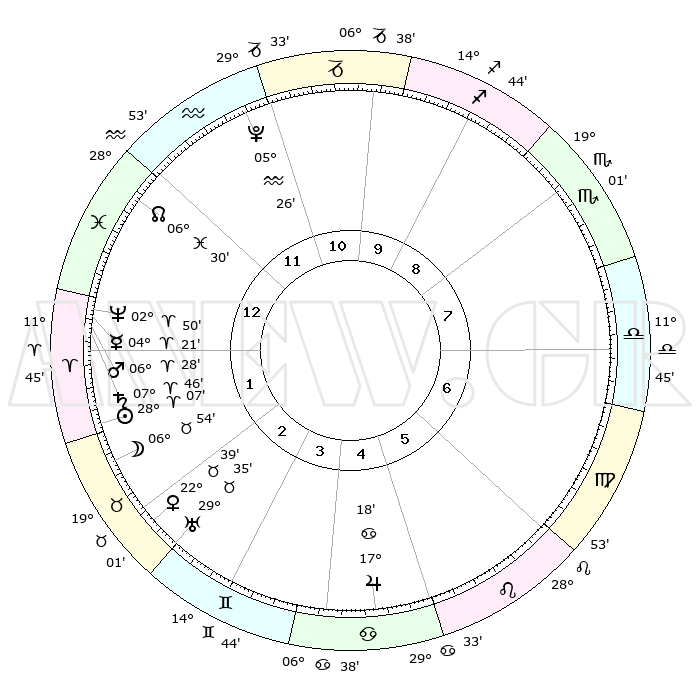 | | ΘΕΣΕΙΣ ΠΛΑΝΗΤΩΝ ΑΣΤΡΟΛΟΓΙΚΟΥ ΧΑΡΤΗ ΤΗΣ ΣΤΙΓΜΗΣ ΑΥΤΗΣ | | | | Πλανήτης | Ζώδιο | Μοίρες | Δεκαήμ. | Σε οίκο | Απόκλιση | | Ακμές των οίκων | | Ηλιος | Κριός | 28°03' | Τρίτο | 2 | 10 N 47 | | 1ος | 05°49' | Ιχθείς | | Σελήνη | Ταύρος | 05°59' | Πρώτο | 2 | 17 N 36 | | 2ος | 20°39' | Κριός | | Ερμής | Κριός | 04°15' | Πρώτο | 1 | 00 S 44 | | 3ος | 22°14' | Ταύρος | | Αφροδίτη | Ταύρος | 22°35' | Τρίτο | 3 | 18 N 43 | | 4ος | 16°06' | Δίδυμοι | | Αρης | Κριός | 06°25' | Πρώτο | 1 | 01 N 40 | | 5ος | 07°48' | Καρκίνος | | Δίας | Καρκίνος | 17°18' | Δεύτερο | 5 | 22 N 42 | | 6ος | 01°58' | Λέων | | Κρόνος | Κριός | 07°45' | Πρώτο | 1 | 01 N 06 | | 7ος | 05°49' | Παρθένος | | Ουρανός | Ταύρος | 29°35' | Τρίτο | 3 | 19 N 54 | | 8ος | 20°39' | Ζυγός | | Ποσειδώνας | Κριός | 02°50' | Πρώτο | 1 | 00 S 05 | | 9ος | 22°14' | Σκορπιός | | Πλούτωνας | Υδροχόος | 05°26' | Πρώτο | 12 | 22 S 47 | | 10ος | 16°06' | Τοξότης | | Β. Δεσμός | Ιχθείς | 06°30' | Πρώτο | 1 | 09 S 07 | | 11ος | 07°48' | Αιγόκερως | | Ωροσκόπος | Ιχθείς | 05°49' | Πρώτο | | | 12ος | 01°59' | Υδροχόος | | Μεσουράνημα | Τοξότης | 16°06' | Δεύτερο | | | |