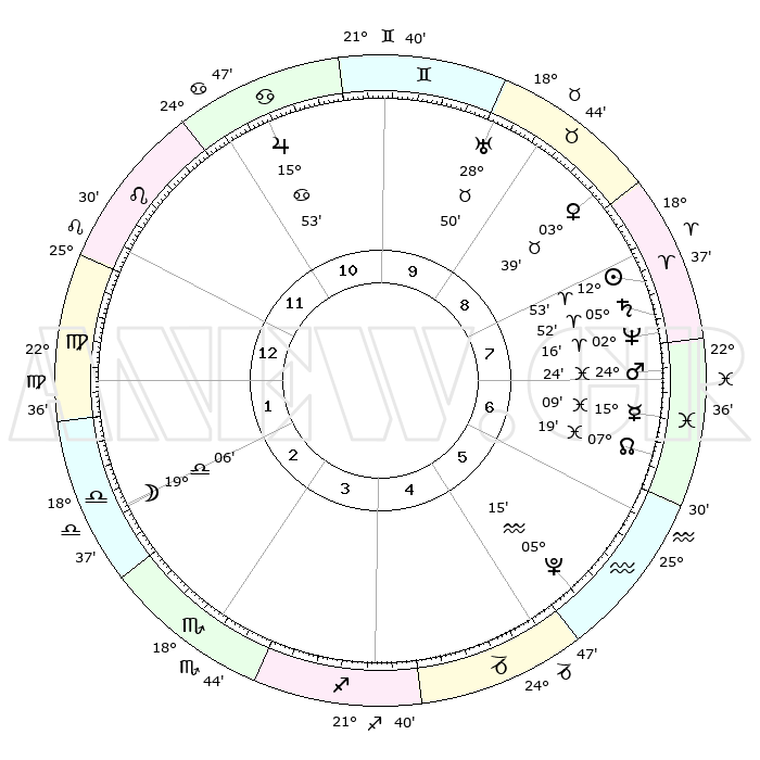 | | ΘΕΣΕΙΣ ΠΛΑΝΗΤΩΝ ΑΣΤΡΟΛΟΓΙΚΟΥ ΧΑΡΤΗ ΤΗΣ ΣΤΙΓΜΗΣ ΑΥΤΗΣ | | | | Πλανήτης | Ζώδιο | Μοίρες | Δεκαήμ. | Σε οίκο | Απόκλιση | | Ακμές των οίκων | | Ηλιος | Κριός | 12°49' | Δεύτερο | 8 | 05 N 04 | | 1ος | 00°37' | Παρθένος | | Σελήνη | Ζυγός | 18°09' | Δεύτερο | 2 | 10 S 10 | | 2ος | 24°32' | Παρθένος | | Ερμής | Ιχθείς | 15°05' | Δεύτερο | 7 | 07 S 18 | | 3ος | 23°15' | Ζυγός | | Αφροδίτη | Ταύρος | 03°34' | Πρώτο | 9 | 12 N 21 | | 4ος | 26°11' | Σκορπιός | | Αρης | Ιχθείς | 24°21' | Τρίτο | 7 | 03 S 12 | | 5ος | 00°20' | Αιγόκερως | | Δίας | Καρκίνος | 15°53' | Δεύτερο | 11 | 22 N 51 | | 6ος | 02°14' | Υδροχόος | | Κρόνος | Κριός | 05°51' | Πρώτο | 8 | 00 N 22 | | 7ος | 00°37' | Ιχθείς | | Ουρανός | Ταύρος | 28°50' | Τρίτο | 10 | 19 N 44 | | 8ος | 24°32' | Ιχθείς | | Ποσειδώνας | Κριός | 02°16' | Πρώτο | 8 | 00 S 18 | | 9ος | 23°15' | Κριός | | Πλούτωνας | Υδροχόος | 05°15' | Πρώτο | 6 | 22 S 47 | | 10ος | 26°11' | Ταύρος | | Β. Δεσμός | Ιχθείς | 07°19' | Πρώτο | 7 | 08 S 49 | | 11ος | 00°20' | Καρκίνος | | Ωροσκόπος | Παρθένος | 00°37' | Πρώτο | | | 12ος | 02°14' | Λέων | | Μεσουράνημα | Ταύρος | 26°11' | Τρίτο | | | |