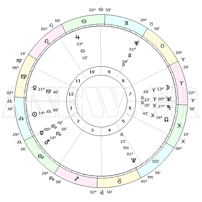 | ΘΕΣΕΙΣ ΠΛΑΝΗΤΩΝ ΑΣΤΡΟΛΟΓΙΚΟΥ ΧΑΡΤΗ ΤΗΣ ΣΤΙΓΜΗΣ ΑΥΤΗΣ | | Πλανήτης | Ζώδιο | Μοίρες | Δεκαήμ. | Σε οίκο | Απόκλιση | | Ακμές των οίκων | Ηλιος | Ζυγός | 14°03' | Δεύτερο | 2 | 05 S 32 | | 1ος | 06°43' | Παρθένος | Σελήνη | Κριός | 12°40' | Δεύτερο | 8 | 07 N 00 | | 2ος | 01°16' | Ζυγός | Ερμής | Σκορπιός | 00°34' | Πρώτο | 3 | 12 S 27 | | 3ος | 00°29' | Σκορπιός | Αφροδίτη | Παρθένος | 21°33' | Τρίτο | 1 | 04 N 39 | | 4ος | 03°26' | Τοξότης | Αρης | Σκορπιός | 10°01' | Δεύτερο | 3 | 14 S 57 | | 5ος | 07°12' | Αιγόκερως | Δίας | Καρκίνος | 23°10' | Τρίτο | 11 | 21 N 29 | | 6ος | 08°42' | Υδροχόος | Κρόνος | Ιχθείς | 27°26'R | Τρίτο | 7 | 03 S 19 | | 7ος | 06°43' | Ιχθείς | Ουρανός | Δίδυμοι | 01°04'R | Πρώτο | 9 | 20 N 10 | | 8ος | 01°16' | Κριός | Ποσειδώνας | Κριός | 00°23'R | Πρώτο | 7 | 01 S 07 | | 9ος | 00°29' | Ταύρος | Πλούτωνας | Υδροχόος | 01°23'R | Πρώτο | 5 | 23 S 32 | | 10ος | 03°26' | Δίδυμοι | Β. Δεσμός | Ιχθείς | 16°43' | Δεύτερο | 7 | 05 S 14 | | 11ος | 07°12' | Καρκίνος | Ωροσκόπος | Παρθένος | 06°43' | Πρώτο | | | 12ος | 08°42' | Λέων | Μεσουράνημα | Δίδυμοι | 03°26' | Πρώτο | | | |