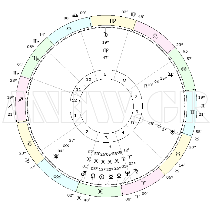 | | ΘΕΣΕΙΣ ΠΛΑΝΗΤΩΝ ΑΣΤΡΟΛΟΓΙΚΟΥ ΧΑΡΤΗ ΤΗΣ ΣΤΙΓΜΗΣ ΑΥΤΗΣ | | | | Πλανήτης | Ζώδιο | Μοίρες | Δεκαήμ. | Σε οίκο | Απόκλιση | | Ακμές των οίκων | | Ηλιος | Ιχθείς | 13°22' | Δεύτερο | 3 | 06 S 32 | | 1ος | 01°11' | Τοξότης | | Σελήνη | Παρθένος | 18°60' | Δεύτερο | 10 | 03 N 30 | | 2ος | 02°29' | Αιγόκερως | | Ερμής | Ιχθείς | 20°08'R | Τρίτο | 4 | 00 S 34 | | 3ος | 08°23' | Υδροχόος | | Αφροδίτη | Ιχθείς | 26°54' | Τρίτο | 4 | 02 S 26 | | 4ος | 14°27' | Ιχθείς | | Αρης | Ιχθείς | 01°04' | Πρώτο | 3 | 12 S 07 | | 5ος | 15°20' | Κριός | | Δίας | Καρκίνος | 15°10'R | Δεύτερο | 8 | 22 N 55 | | 6ος | 10°13' | Ταύρος | | Κρόνος | Κριός | 02°11' | Πρώτο | 4 | 01 S 05 | | 7ος | 01°11' | Δίδυμοι | | Ουρανός | Ταύρος | 27°48' | Τρίτο | 6 | 19 N 29 | | 8ος | 02°29' | Καρκίνος | | Ποσειδώνας | Κριός | 01°09' | Πρώτο | 4 | 00 S 44 | | 9ος | 08°23' | Λέων | | Πλούτωνας | Υδροχόος | 04°37' | Πρώτο | 2 | 22 S 52 | | 10ος | 14°27' | Παρθένος | | Β. Δεσμός | Ιχθείς | 08°53' | Πρώτο | 3 | 08 S 14 | | 11ος | 15°20' | Ζυγός | | Ωροσκόπος | Τοξότης | 01°11' | Πρώτο | | | 12ος | 10°13' | Σκορπιός | | Μεσουράνημα | Παρθένος | 14°27' | Δεύτερο | | | |
