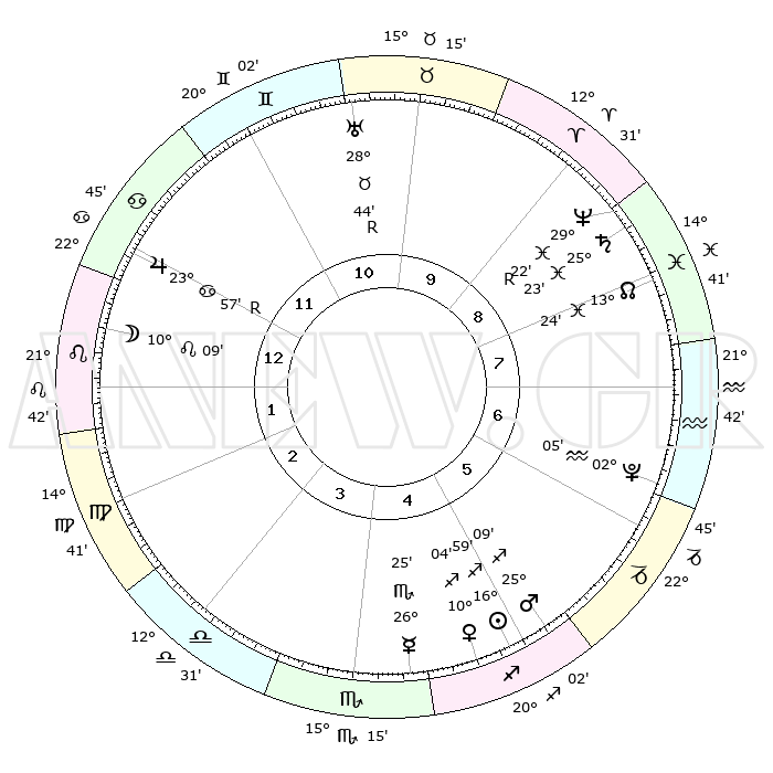 | | ΘΕΣΕΙΣ ΠΛΑΝΗΤΩΝ ΑΣΤΡΟΛΟΓΙΚΟΥ ΧΑΡΤΗ ΤΗΣ ΣΤΙΓΜΗΣ ΑΥΤΗΣ | | | | Πλανήτης | Ζώδιο | Μοίρες | Δεκαήμ. | Σε οίκο | Απόκλιση | | Ακμές των οίκων | | Ηλιος | Τοξότης | 16°57' | Δεύτερο | 5 | 22 S 48 | | 1ος | 10°15' | Λέων | | Σελήνη | Λέων | 09°35' | Πρώτο | 12 | 20 N 32 | | 2ος | 02°06' | Παρθένος | | Ερμής | Σκορπιός | 26°22' | Τρίτο | 4 | 17 S 09 | | 3ος | 28°32' | Παρθένος | | Αφροδίτη | Τοξότης | 10°01' | Δεύτερο | 5 | 21 S 32 | | 4ος | 00°37' | Σκορπιός | | Αρης | Τοξότης | 25°07' | Τρίτο | 5 | 24 S 04 | | 5ος | 06°12' | Τοξότης | | Δίας | Καρκίνος | 23°57'R | Τρίτο | 12 | 21 N 29 | | 6ος | 10°20' | Αιγόκερως | | Κρόνος | Ιχθείς | 25°23' | Τρίτο | 8 | 03 S 59 | | 7ος | 10°15' | Υδροχόος | | Ουρανός | Ταύρος | 28°44'R | Τρίτο | 10 | 19 N 40 | | 8ος | 02°06' | Ιχθείς | | Ποσειδώνας | Ιχθείς | 29°22'R | Τρίτο | 9 | 01 S 29 | | 9ος | 28°32' | Ιχθείς | | Πλούτωνας | Υδροχόος | 02°05' | Πρώτο | 6 | 23 S 22 | | 10ος | 00°37' | Ταύρος | | Β. Δεσμός | Ιχθείς | 13°24' | Δεύτερο | 8 | 06 S 31 | | 11ος | 06°12' | Δίδυμοι | | Ωροσκόπος | Λέων | 10°15' | Δεύτερο | | | 12ος | 10°20' | Καρκίνος | | Μεσουράνημα | Ταύρος | 00°37' | Πρώτο | | | |
