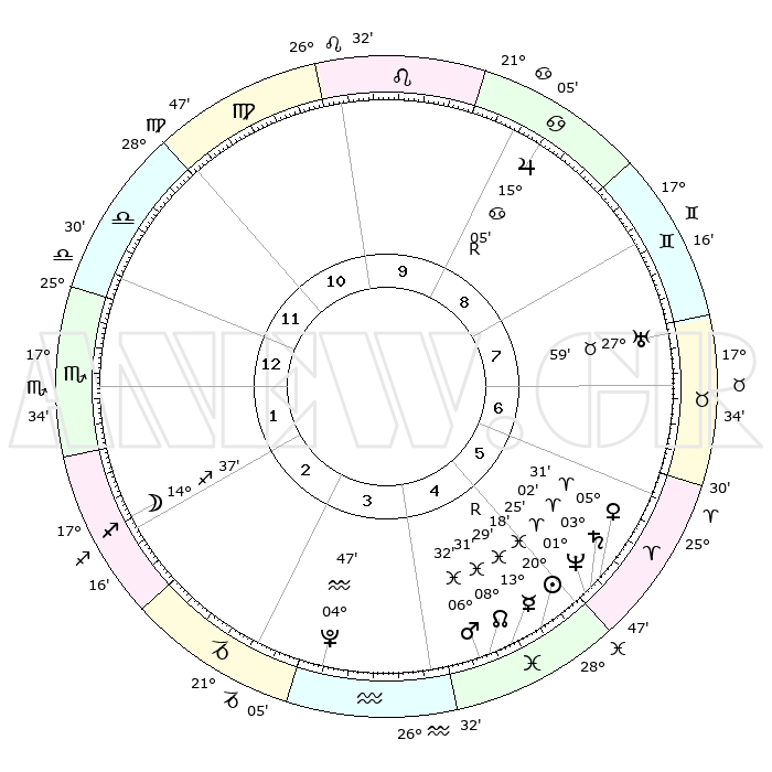 | | ΘΕΣΕΙΣ ΠΛΑΝΗΤΩΝ ΑΣΤΡΟΛΟΓΙΚΟΥ ΧΑΡΤΗ ΤΗΣ ΣΤΙΓΜΗΣ ΑΥΤΗΣ | | | | Πλανήτης | Ζώδιο | Μοίρες | Δεκαήμ. | Σε οίκο | Απόκλιση | | Ακμές των οίκων | | Ηλιος | Ιχθείς | 20°15' | Τρίτο | 5 | 03 S 52 | | 1ος | 00°27' | Σκορπιός | | Σελήνη | Τοξότης | 13°55' | Δεύτερο | 2 | 27 S 41 | | 2ος | 28°53' | Σκορπιός | | Ερμής | Ιχθείς | 13°32'R | Δεύτερο | 5 | 03 S 28 | | 3ος | 00°53' | Αιγόκερως | | Αφροδίτη | Κριός | 05°27' | Πρώτο | 5 | 01 N 06 | | 4ος | 05°06' | Υδροχόος | | Αρης | Ιχθείς | 06°29' | Πρώτο | 4 | 10 S 09 | | 5ος | 08°01' | Ιχθείς | | Δίας | Καρκίνος | 15°05'R | Δεύτερο | 9 | 22 N 56 | | 6ος | 06°39' | Κριός | | Κρόνος | Κριός | 03°02' | Πρώτο | 5 | 00 S 45 | | 7ος | 00°27' | Ταύρος | | Ουρανός | Ταύρος | 27°59' | Τρίτο | 7 | 19 N 32 | | 8ος | 28°53' | Ταύρος | | Ποσειδώνας | Κριός | 01°25' | Πρώτο | 5 | 00 S 38 | | 9ος | 00°53' | Καρκίνος | | Πλούτωνας | Υδροχόος | 04°47' | Πρώτο | 3 | 22 S 50 | | 10ος | 05°06' | Λέων | | Β. Δεσμός | Ιχθείς | 08°31' | Πρώτο | 5 | 08 S 22 | | 11ος | 08°01' | Παρθένος | | Ωροσκόπος | Σκορπιός | 00°27' | Πρώτο | | | 12ος | 06°39' | Ζυγός | | Μεσουράνημα | Λέων | 05°06' | Πρώτο | | | |