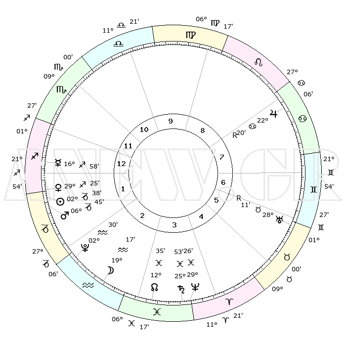| | ΘΕΣΕΙΣ ΠΛΑΝΗΤΩΝ ΑΣΤΡΟΛΟΓΙΚΟΥ ΧΑΡΤΗ ΤΗΣ ΣΤΙΓΜΗΣ ΑΥΤΗΣ | | | | Πλανήτης | Ζώδιο | Μοίρες | Δεκαήμ. | Σε οίκο | Απόκλιση | | Ακμές των οίκων | | Ηλιος | Αιγόκερως | 02°33' | Πρώτο | 2 | 23 S 24 | | 1ος | 28°30' | Σκορπιός | | Σελήνη | Υδροχόος | 18°19' | Δεύτερο | 3 | 17 S 13 | | 2ος | 29°25' | Τοξότης | | Ερμής | Τοξότης | 16°51' | Δεύτερο | 1 | 22 S 25 | | 3ος | 04°53' | Υδροχόος | | Αφροδίτη | Τοξότης | 29°19' | Τρίτο | 1 | 23 S 38 | | 4ος | 10°53' | Ιχθείς | | Αρης | Αιγόκερως | 06°41' | Πρώτο | 2 | 24 S 06 | | 5ος | 12°06' | Κριός | | Δίας | Καρκίνος | 22°21'R | Τρίτο | 8 | 21 N 48 | | 6ος | 07°21' | Ταύρος | | Κρόνος | Ιχθείς | 25°53' | Τρίτο | 4 | 03 S 44 | | 7ος | 28°30' | Ταύρος | | Ουρανός | Ταύρος | 28°11'R | Τρίτο | 6 | 19 N 33 | | 8ος | 29°25' | Δίδυμοι | | Ποσειδώνας | Ιχθείς | 29°26' | Τρίτο | 4 | 01 S 27 | | 9ος | 04°53' | Λέων | | Πλούτωνας | Υδροχόος | 02°30' | Πρώτο | 2 | 23 S 16 | | 10ος | 10°53' | Παρθένος | | Β. Δεσμός | Ιχθείς | 12°35' | Δεύτερο | 4 | 06 S 50 | | 11ος | 12°06' | Ζυγός | | Ωροσκόπος | Σκορπιός | 28°30' | Τρίτο | | | 12ος | 07°21' | Σκορπιός | | Μεσουράνημα | Παρθένος | 10°53' | Δεύτερο | | | |