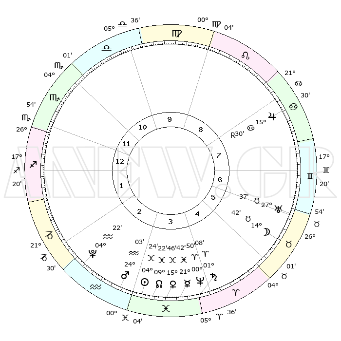 | | ΘΕΣΕΙΣ ΠΛΑΝΗΤΩΝ ΑΣΤΡΟΛΟΓΙΚΟΥ ΧΑΡΤΗ ΤΗΣ ΣΤΙΓΜΗΣ ΑΥΤΗΣ | | | | Πλανήτης | Ζώδιο | Μοίρες | Δεκαήμ. | Σε οίκο | Απόκλιση | | Ακμές των οίκων | | Ηλιος | Ιχθείς | 04°19' | Πρώτο | 4 | 09 S 55 | | 1ος | 22°36' | Σκορπιός | | Σελήνη | Ταύρος | 13°31' | Δεύτερο | 6 | 20 N 27 | | 2ος | 22°49' | Τοξότης | | Ερμής | Ιχθείς | 21°39' | Τρίτο | 4 | 01 S 28 | | 3ος | 27°22' | Αιγόκερως | | Αφροδίτη | Ιχθείς | 15°40' | Δεύτερο | 4 | 06 S 58 | | 4ος | 03°07' | Ιχθείς | | Αρης | Υδροχόος | 23°59' | Τρίτο | 3 | 14 S 33 | | 5ος | 04°57' | Κριός | | Δίας | Καρκίνος | 15°31'R | Δεύτερο | 8 | 22 N 52 | | 6ος | 01°00' | Ταύρος | | Κρόνος | Κριός | 01°08' | Πρώτο | 4 | 01 S 31 | | 7ος | 22°36' | Ταύρος | | Ουρανός | Ταύρος | 27°37' | Τρίτο | 7 | 19 N 27 | | 8ος | 22°49' | Δίδυμοι | | Ποσειδώνας | Κριός | 00°50' | Πρώτο | 4 | 00 S 52 | | 9ος | 27°22' | Καρκίνος | | Πλούτωνας | Υδροχόος | 04°22' | Πρώτο | 3 | 22 S 54 | | 10ος | 03°07' | Παρθένος | | Β. Δεσμός | Ιχθείς | 09°22' | Πρώτο | 4 | 08 S 03 | | 11ος | 04°57' | Ζυγός | | Ωροσκόπος | Σκορπιός | 22°36' | Τρίτο | | | 12ος | 01°00' | Σκορπιός | | Μεσουράνημα | Παρθένος | 03°07' | Πρώτο | | | |
