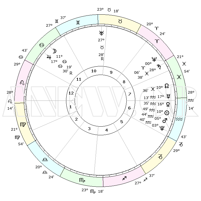 | | ΘΕΣΕΙΣ ΠΛΑΝΗΤΩΝ ΑΣΤΡΟΛΟΓΙΚΟΥ ΧΑΡΤΗ ΤΗΣ ΣΤΙΓΜΗΣ ΑΥΤΗΣ | | | | Πλανήτης | Ζώδιο | Μοίρες | Δεκαήμ. | Σε οίκο | Απόκλιση | | Ακμές των οίκων | | Ηλιος | Υδροχόος | 10°46' | Δεύτερο | 6 | 17 S 32 | | 1ος | 11°56' | Λέων | | Σελήνη | Καρκίνος | 10°30' | Δεύτερο | 11 | 27 N 27 | | 2ος | 03°57' | Παρθένος | | Ερμής | Υδροχόος | 17°07' | Δεύτερο | 7 | 17 S 34 | | 3ος | 00°36' | Ζυγός | | Αφροδίτη | Υδροχόος | 16°30' | Δεύτερο | 7 | 17 S 10 | | 4ος | 02°49' | Σκορπιός | | Αρης | Υδροχόος | 05°41' | Πρώτο | 6 | 19 S 51 | | 5ος | 08°18' | Τοξότης | | Δίας | Καρκίνος | 17°30'R | Δεύτερο | 12 | 22 N 35 | | 6ος | 12°11' | Αιγόκερως | | Κρόνος | Ιχθείς | 28°38' | Τρίτο | 8 | 02 S 33 | | 7ος | 11°56' | Υδροχόος | | Ουρανός | Ταύρος | 27°28'R | Τρίτο | 10 | 19 N 24 | | 8ος | 03°57' | Ιχθείς | | Ποσειδώνας | Κριός | 00°06' | Πρώτο | 8 | 01 S 10 | | 9ος | 00°36' | Κριός | | Πλούτωνας | Υδροχόος | 03°40' | Πρώτο | 6 | 23 S 02 | | 10ος | 02°49' | Ταύρος | | Β. Δεσμός | Ιχθείς | 10°36' | Δεύτερο | 8 | 07 S 35 | | 11ος | 08°18' | Δίδυμοι | | Ωροσκόπος | Λέων | 11°56' | Δεύτερο | | | 12ος | 12°11' | Καρκίνος | | Μεσουράνημα | Ταύρος | 02°49' | Πρώτο | | | |