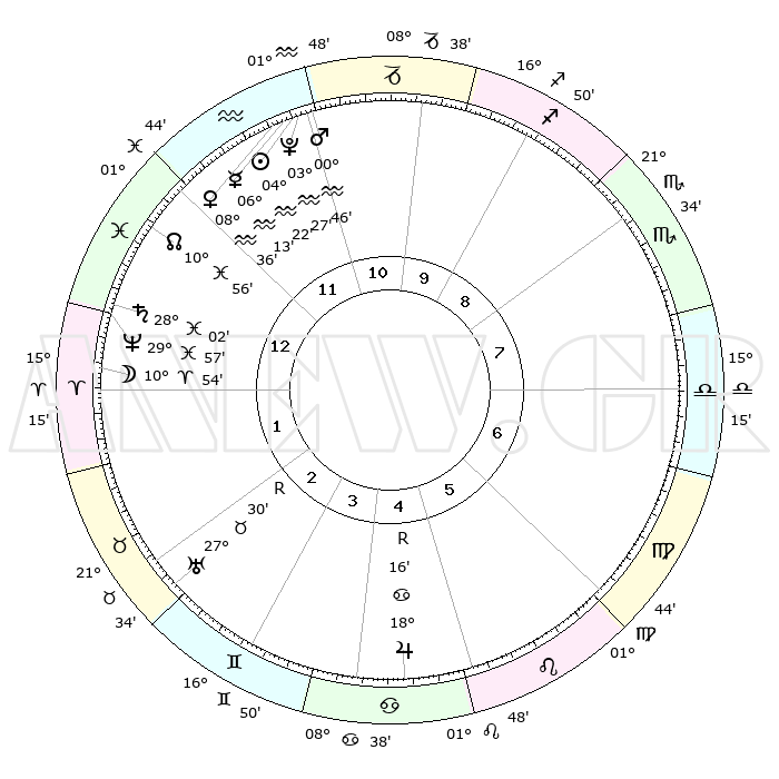 | | ΘΕΣΕΙΣ ΠΛΑΝΗΤΩΝ ΑΣΤΡΟΛΟΓΙΚΟΥ ΧΑΡΤΗ ΤΗΣ ΣΤΙΓΜΗΣ ΑΥΤΗΣ | | | | Πλανήτης | Ζώδιο | Μοίρες | Δεκαήμ. | Σε οίκο | Απόκλιση | | Ακμές των οίκων | | Ηλιος | Υδροχόος | 04°17' | Πρώτο | 12 | 19 S 11 | | 1ος | 29°38' | Υδροχόος | | Σελήνη | Κριός | 09°50' | Πρώτο | 1 | 06 N 19 | | 2ος | 15°05' | Κριός | | Ερμής | Υδροχόος | 06°05' | Πρώτο | 12 | 20 S 46 | | 3ος | 17°52' | Ταύρος | | Αφροδίτη | Υδροχόος | 08°30' | Πρώτο | 12 | 19 S 18 | | 4ος | 12°18' | Δίδυμοι | | Αρης | Υδροχόος | 00°43' | Πρώτο | 12 | 20 S 59 | | 5ος | 03°59' | Καρκίνος | | Δίας | Καρκίνος | 18°16'R | Δεύτερο | 5 | 22 N 29 | | 6ος | 27°31' | Καρκίνος | | Κρόνος | Ιχθείς | 28°02' | Τρίτο | 1 | 02 S 48 | | 7ος | 29°38' | Λέων | | Ουρανός | Ταύρος | 27°30'R | Τρίτο | 3 | 19 N 25 | | 8ος | 15°05' | Ζυγός | | Ποσειδώνας | Ιχθείς | 29°57' | Τρίτο | 1 | 01 S 14 | | 9ος | 17°52' | Σκορπιός | | Πλούτωνας | Υδροχόος | 03°27' | Πρώτο | 12 | 23 S 04 | | 10ος | 12°18' | Τοξότης | | Β. Δεσμός | Ιχθείς | 10°56' | Δεύτερο | 1 | 07 S 28 | | 11ος | 03°59' | Αιγόκερως | | Ωροσκόπος | Υδροχόος | 29°38' | Τρίτο | | | 12ος | 27°31' | Αιγόκερως | | Μεσουράνημα | Τοξότης | 12°18' | Δεύτερο | | | |