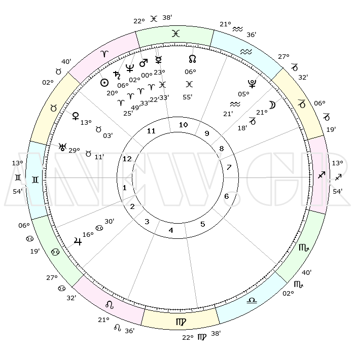 | | ΘΕΣΕΙΣ ΠΛΑΝΗΤΩΝ ΑΣΤΡΟΛΟΓΙΚΟΥ ΧΑΡΤΗ ΤΗΣ ΣΤΙΓΜΗΣ ΑΥΤΗΣ | | | | Πλανήτης | Ζώδιο | Μοίρες | Δεκαήμ. | Σε οίκο | Απόκλιση | | Ακμές των οίκων | | Ηλιος | Κριός | 20°21' | Τρίτο | 12 | 07 N 57 | | 1ος | 07°36' | Ταύρος | | Σελήνη | Αιγόκερως | 20°18' | Τρίτο | 9 | 25 S 41 | | 2ος | 07°45' | Δίδυμοι | | Ερμής | Ιχθείς | 23°27' | Τρίτο | 12 | 04 S 46 | | 3ος | 00°35' | Καρκίνος | | Αφροδίτη | Ταύρος | 12°57' | Δεύτερο | 1 | 15 N 41 | | 4ος | 22°22' | Καρκίνος | | Αρης | Κριός | 00°18' | Πρώτο | 12 | 00 S 48 | | 5ος | 17°35' | Λέων | | Δίας | Καρκίνος | 16°30' | Δεύτερο | 3 | 22 N 47 | | 6ος | 21°49' | Παρθένος | | Κρόνος | Κριός | 06°48' | Πρώτο | 12 | 00 N 44 | | 7ος | 07°36' | Σκορπιός | | Ουρανός | Ταύρος | 29°11' | Τρίτο | 1 | 19 N 48 | | 8ος | 07°45' | Τοξότης | | Ποσειδώνας | Κριός | 02°33' | Πρώτο | 12 | 00 S 11 | | 9ος | 00°35' | Αιγόκερως | | Πλούτωνας | Υδροχόος | 05°21' | Πρώτο | 10 | 22 S 47 | | 10ος | 22°22' | Αιγόκερως | | Β. Δεσμός | Ιχθείς | 06°55' | Πρώτο | 11 | 08 S 58 | | 11ος | 17°35' | Υδροχόος | | Ωροσκόπος | Ταύρος | 07°36' | Πρώτο | | | 12ος | 21°49' | Ιχθείς | | Μεσουράνημα | Αιγόκερως | 22°22' | Τρίτο | | | |