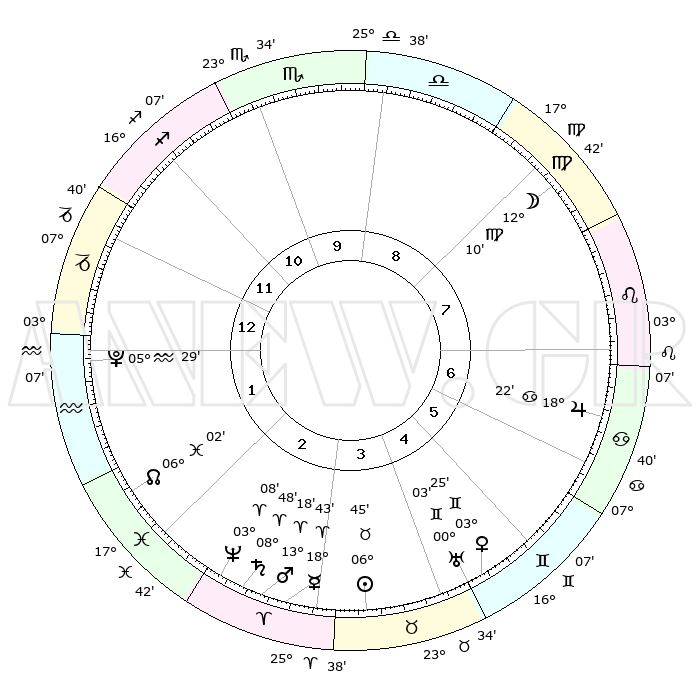 | | ΘΕΣΕΙΣ ΠΛΑΝΗΤΩΝ ΑΣΤΡΟΛΟΓΙΚΟΥ ΧΑΡΤΗ ΤΗΣ ΣΤΙΓΜΗΣ ΑΥΤΗΣ | | | | Πλανήτης | Ζώδιο | Μοίρες | Δεκαήμ. | Σε οίκο | Απόκλιση | | Ακμές των οίκων | | Ηλιος | Ταύρος | 06°41' | Πρώτο | 4 | 13 N 45 | | 1ος | 10°23' | Αιγόκερως | | Σελήνη | Παρθένος | 11°25' | Δεύτερο | 8 | 06 N 57 | | 2ος | 20°11' | Υδροχόος | | Ερμής | Κριός | 18°37' | Δεύτερο | 3 | 05 N 10 | | 3ος | 00°28' | Κριός | | Αφροδίτη | Δίδυμοι | 03°21' | Πρώτο | 5 | 21 N 31 | | 4ος | 02°35' | Ταύρος | | Αρης | Κριός | 13°15' | Δεύτερο | 3 | 04 N 23 | | 5ος | 27°22' | Ταύρος | | Δίας | Καρκίνος | 18°22' | Δεύτερο | 7 | 22 N 33 | | 6ος | 18°41' | Δίδυμοι | | Κρόνος | Κριός | 08°48' | Πρώτο | 3 | 01 N 30 | | 7ος | 10°23' | Καρκίνος | | Ουρανός | Δίδυμοι | 00°03' | Πρώτο | 5 | 20 N 00 | | 8ος | 20°11' | Λέων | | Ποσειδώνας | Κριός | 03°08' | Πρώτο | 3 | 00 N 02 | | 9ος | 00°28' | Ζυγός | | Πλούτωνας | Υδροχόος | 05°29' | Πρώτο | 1 | 22 S 48 | | 10ος | 02°35' | Σκορπιός | | Β. Δεσμός | Ιχθείς | 06°02' | Πρώτο | 2 | 09 S 18 | | 11ος | 27°22' | Σκορπιός | | Ωροσκόπος | Αιγόκερως | 10°23' | Δεύτερο | | | 12ος | 18°41' | Τοξότης | | Μεσουράνημα | Σκορπιός | 02°35' | Πρώτο | | | |