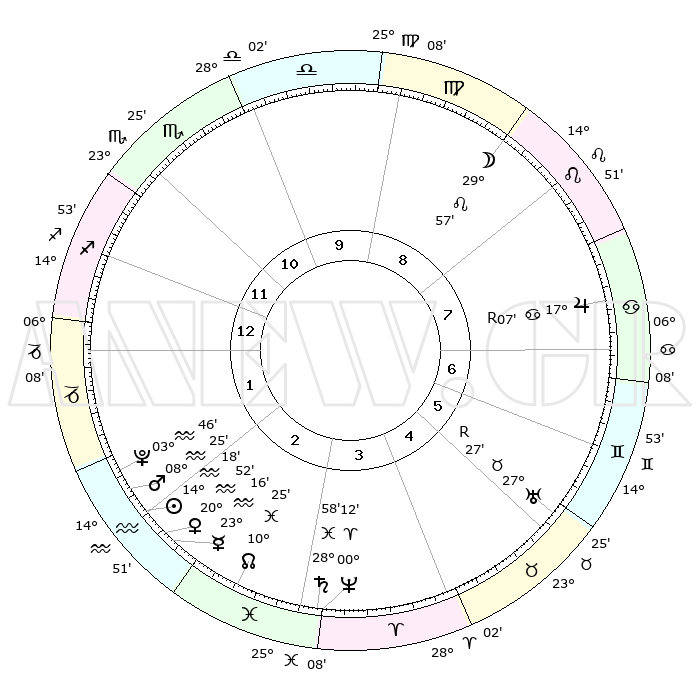 | | ΘΕΣΕΙΣ ΠΛΑΝΗΤΩΝ ΑΣΤΡΟΛΟΓΙΚΟΥ ΧΑΡΤΗ ΤΗΣ ΣΤΙΓΜΗΣ ΑΥΤΗΣ | | | | Πλανήτης | Ζώδιο | Μοίρες | Δεκαήμ. | Σε οίκο | Απόκλιση | | Ακμές των οίκων | | Ηλιος | Υδροχόος | 14°14' | Δεύτερο | 2 | 16 S 33 | | 1ος | 15°29' | Τοξότης | | Σελήνη | Λέων | 29°05' | Τρίτο | 9 | 12 N 39 | | 2ος | 19°16' | Αιγόκερως | | Ερμής | Υδροχόος | 23°09' | Τρίτο | 2 | 15 S 26 | | 3ος | 27°33' | Υδροχόος | | Αφροδίτη | Υδροχόος | 20°47' | Τρίτο | 2 | 15 S 53 | | 4ος | 03°14' | Κριός | | Αρης | Υδροχόος | 08°22' | Πρώτο | 2 | 19 S 11 | | 5ος | 01°58' | Ταύρος | | Δίας | Καρκίνος | 17°08'R | Δεύτερο | 7 | 22 N 39 | | 6ος | 25°03' | Ταύρος | | Κρόνος | Ιχθείς | 28°58' | Τρίτο | 3 | 02 S 24 | | 7ος | 15°29' | Δίδυμοι | | Ουρανός | Ταύρος | 27°27'R | Τρίτο | 6 | 19 N 24 | | 8ος | 19°16' | Καρκίνος | | Ποσειδώνας | Κριός | 00°12' | Πρώτο | 3 | 01 S 08 | | 9ος | 27°33' | Λέων | | Πλούτωνας | Υδροχόος | 03°46' | Πρώτο | 2 | 23 S 01 | | 10ος | 03°14' | Ζυγός | | Β. Δεσμός | Ιχθείς | 10°25' | Δεύτερο | 3 | 07 S 40 | | 11ος | 01°58' | Σκορπιός | | Ωροσκόπος | Τοξότης | 15°29' | Δεύτερο | | | 12ος | 25°03' | Σκορπιός | | Μεσουράνημα | Ζυγός | 03°14' | Πρώτο | | | |
