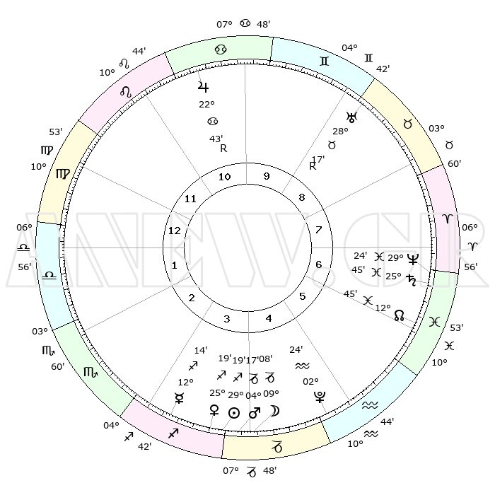 | | ΘΕΣΕΙΣ ΠΛΑΝΗΤΩΝ ΑΣΤΡΟΛΟΓΙΚΟΥ ΧΑΡΤΗ ΤΗΣ ΣΤΙΓΜΗΣ ΑΥΤΗΣ | | | | Πλανήτης | Ζώδιο | Μοίρες | Δεκαήμ. | Σε οίκο | Απόκλιση | | Ακμές των οίκων | | Ηλιος | Τοξότης | 29°15' | Τρίτο | 4 | 23 S 26 | | 1ος | 15°02' | Παρθένος | | Σελήνη | Αιγόκερως | 08°14' | Πρώτο | 4 | 27 S 39 | | 2ος | 10°23' | Ζυγός | | Ερμής | Τοξότης | 12°08' | Δεύτερο | 3 | 21 S 28 | | 3ος | 10°09' | Σκορπιός | | Αφροδίτη | Τοξότης | 25°14' | Τρίτο | 4 | 23 S 25 | | 4ος | 13°05' | Τοξότης | | Αρης | Αιγόκερως | 04°13' | Πρώτο | 4 | 24 S 11 | | 5ος | 16°27' | Αιγόκερως | | Δίας | Καρκίνος | 22°44'R | Τρίτο | 11 | 21 N 44 | | 6ος | 17°29' | Υδροχόος | | Κρόνος | Ιχθείς | 25°44' | Τρίτο | 7 | 03 S 48 | | 7ος | 15°02' | Ιχθείς | | Ουρανός | Ταύρος | 28°17'R | Τρίτο | 9 | 19 N 35 | | 8ος | 10°23' | Κριός | | Ποσειδώνας | Ιχθείς | 29°24' | Τρίτο | 7 | 01 S 28 | | 9ος | 10°09' | Ταύρος | | Πλούτωνας | Υδροχόος | 02°24' | Πρώτο | 5 | 23 S 17 | | 10ος | 13°05' | Δίδυμοι | | Β. Δεσμός | Ιχθείς | 12°45' | Δεύτερο | 6 | 06 S 46 | | 11ος | 16°27' | Καρκίνος | | Ωροσκόπος | Παρθένος | 15°02' | Δεύτερο | | | 12ος | 17°29' | Λέων | | Μεσουράνημα | Δίδυμοι | 13°05' | Δεύτερο | | | |